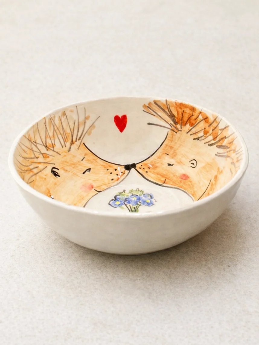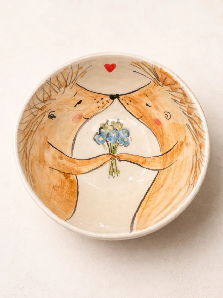 Очаровательная пиала, украшенная милой росписью влюблённых ежей с букетом.