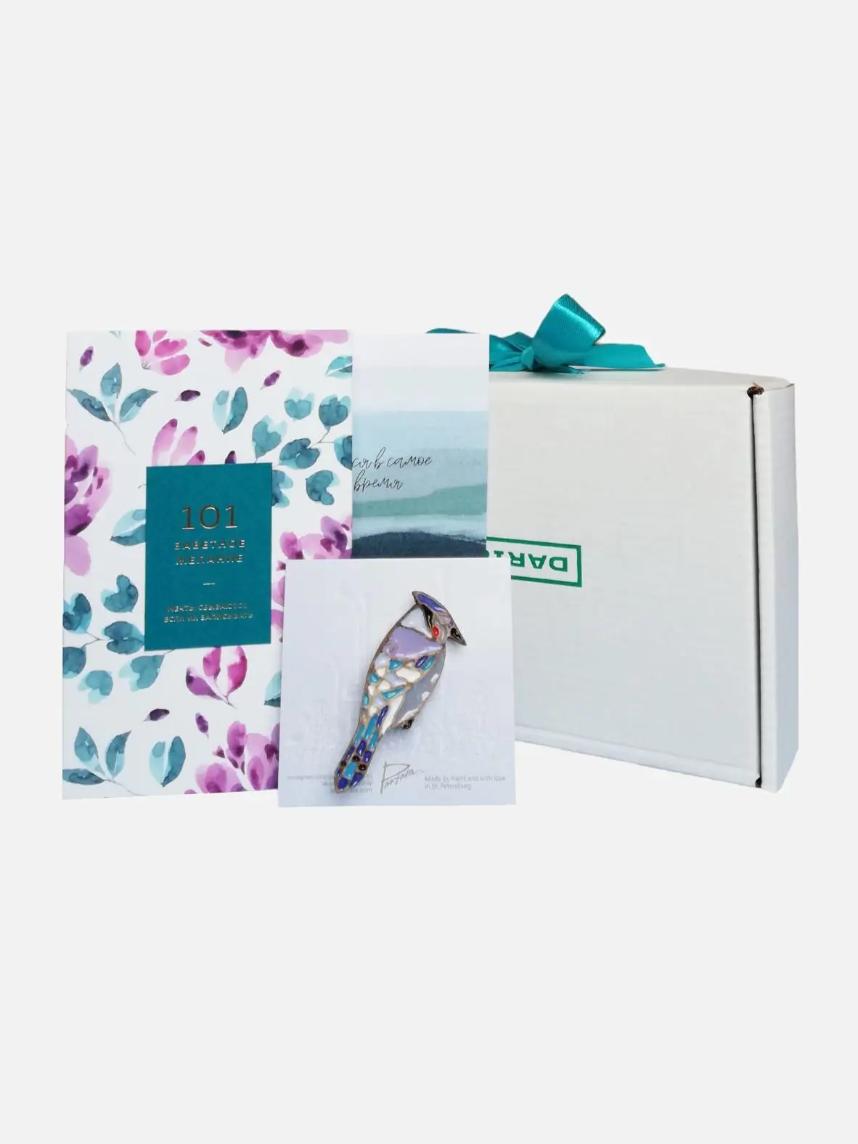 Подарочный набор на 14 февраля с блокнотом «101 заветное желание» №5 и брошью ручной работы «Сойка»