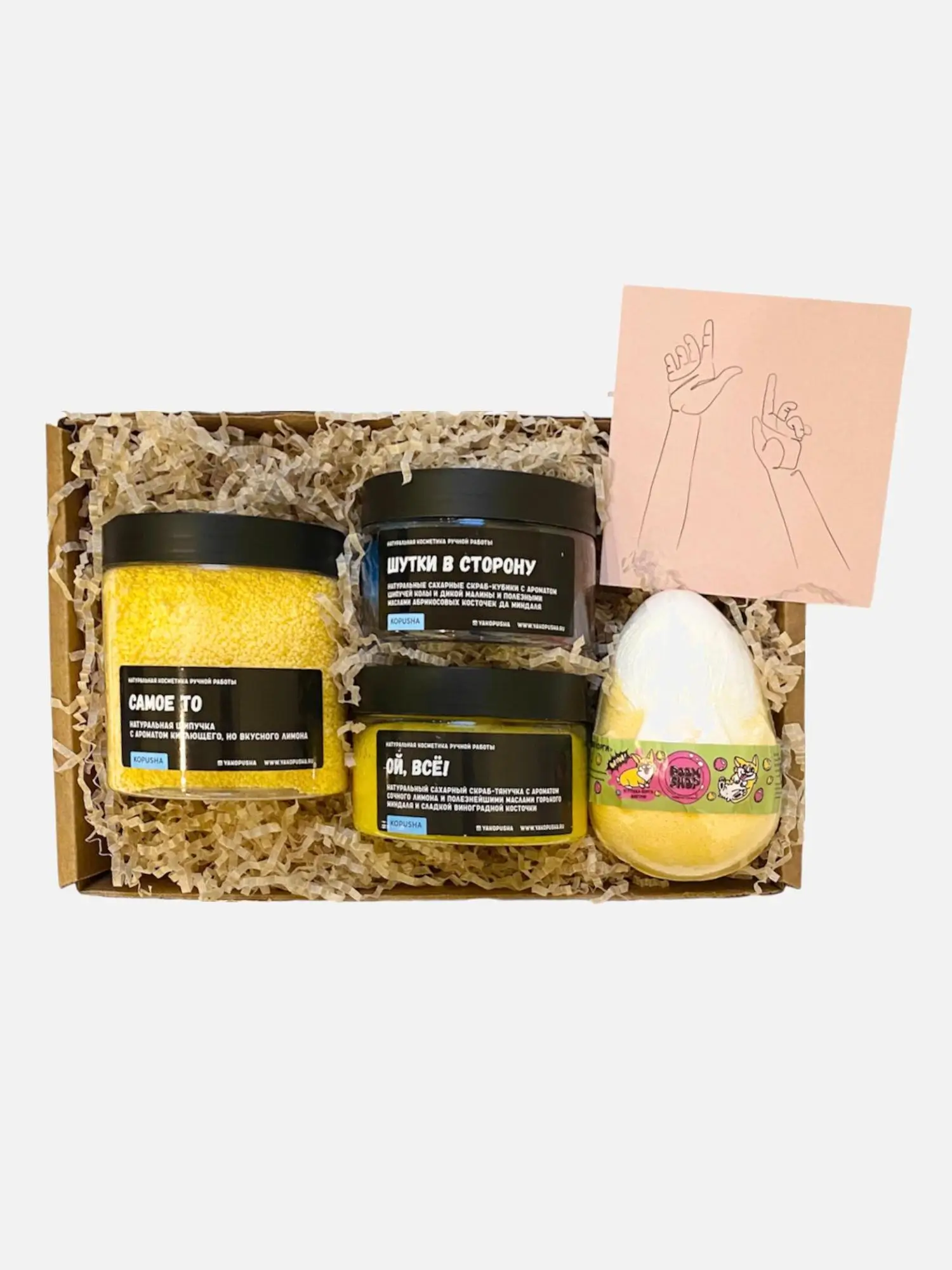 - две баночки ароматных скрабов: скраб-тянучка с ароматом срочного лимона и скраб-кубики с ароматом шипучей колы и дикой малины