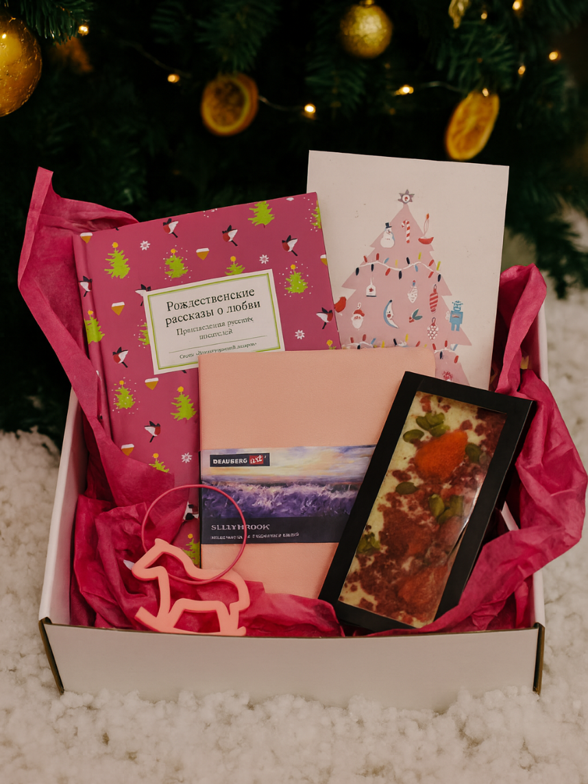 Подарочный набор на Новый год с книгой «Рождественские рассказы о любви», скетчбуком, брелком и шоколадом
