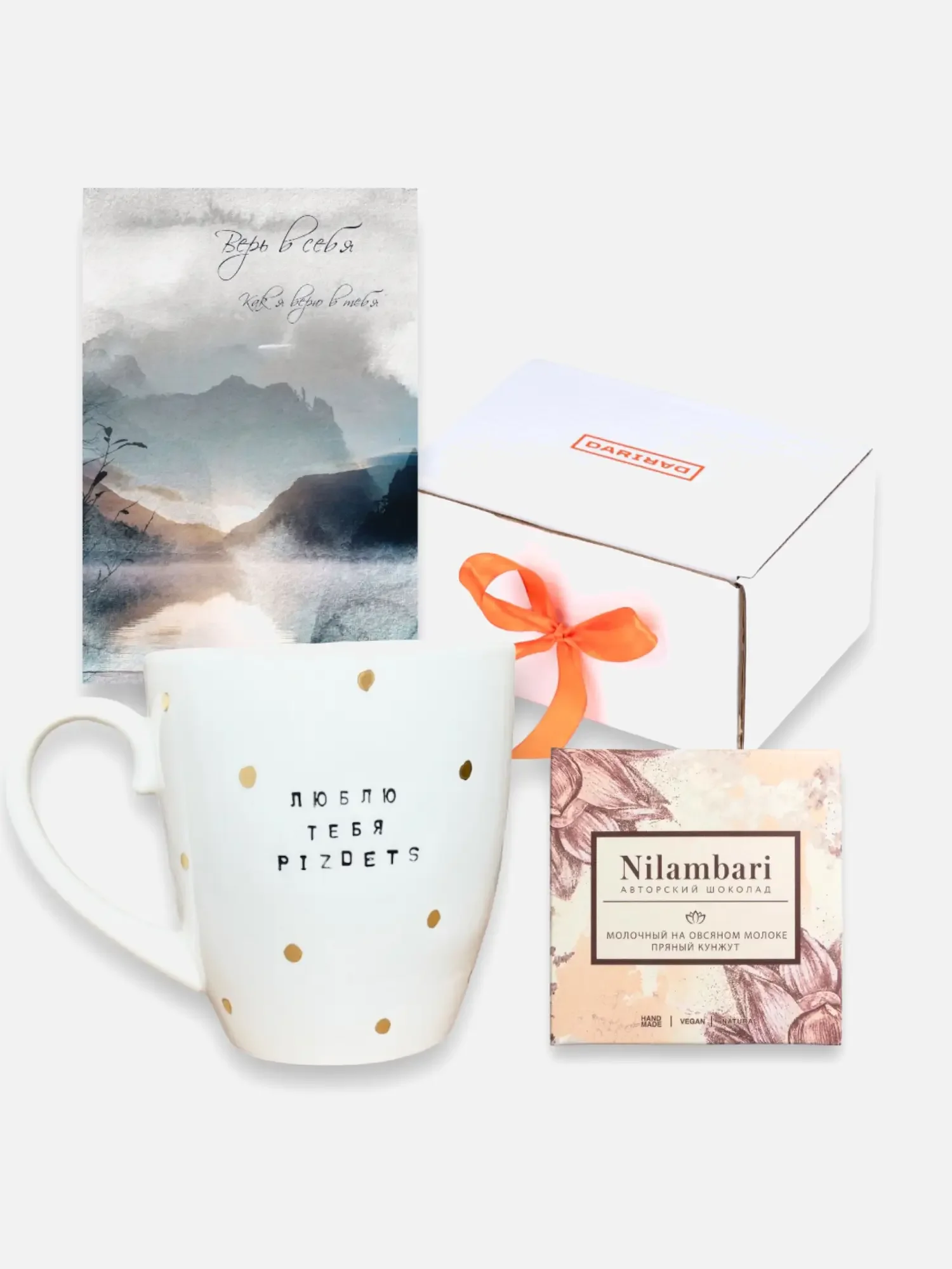 Подарочный набор с бело-золотой кружкой «Люблю тебя p***etz» и шоколадом