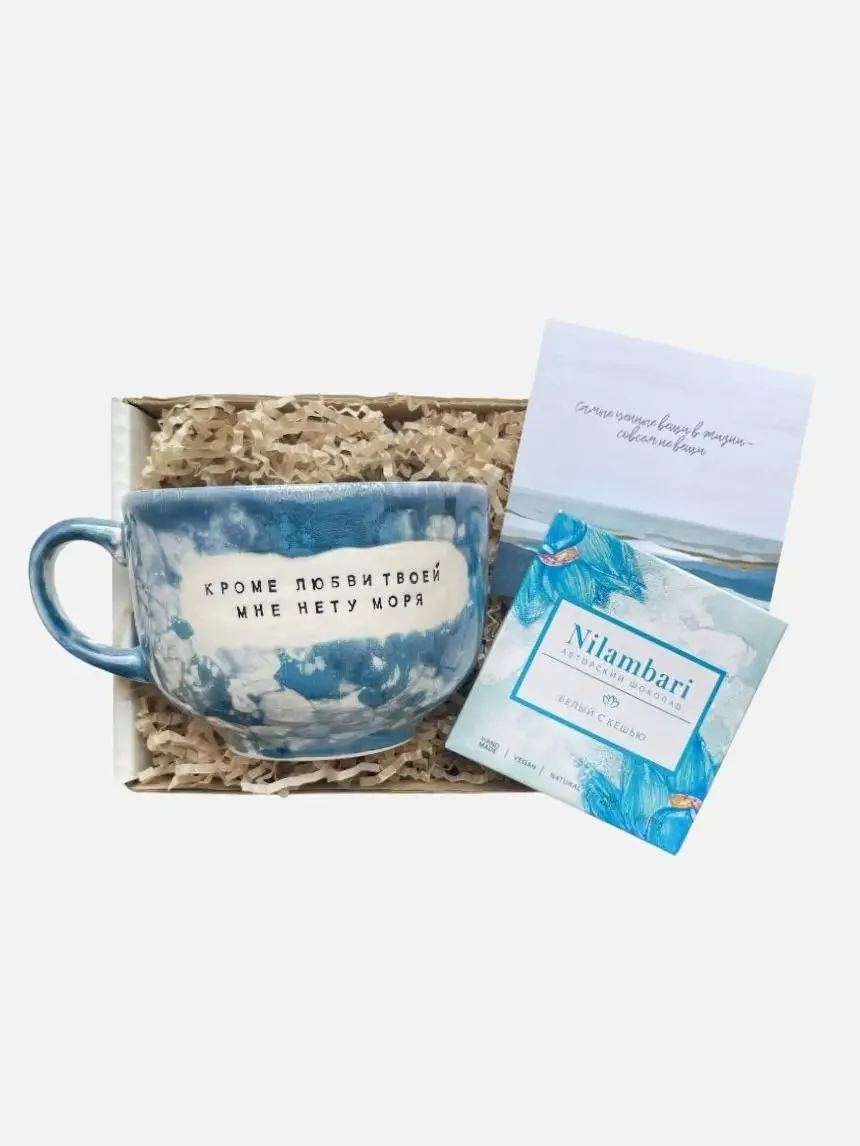 Подарочный набор с голубой кружкой «Кроме любви твоей мне нету моря» и шоколадом