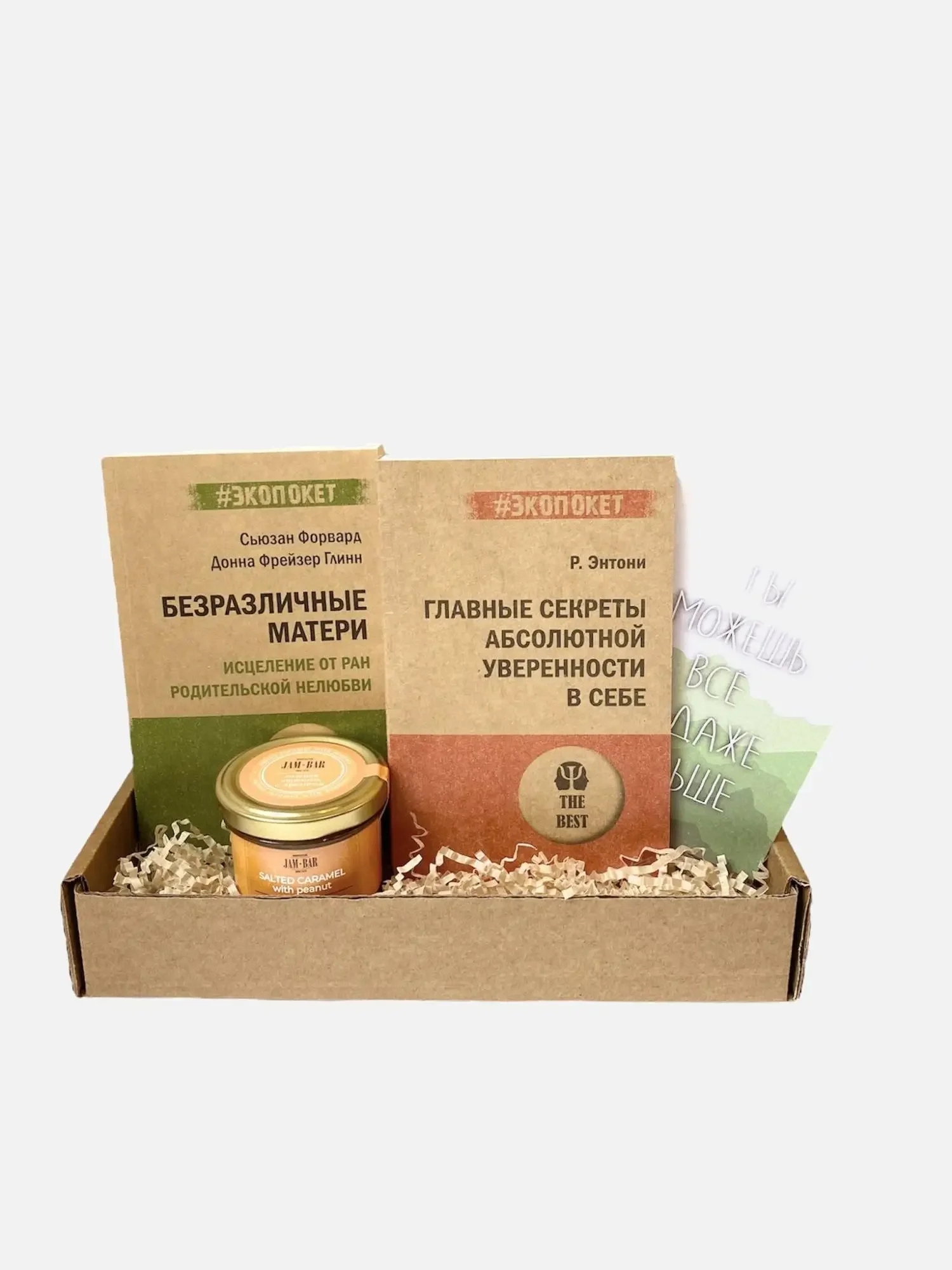 Подарочный набор с книгами «Безразличные матери», «Главные секреты абсолютной уверенности в себе» и соленой карамелью