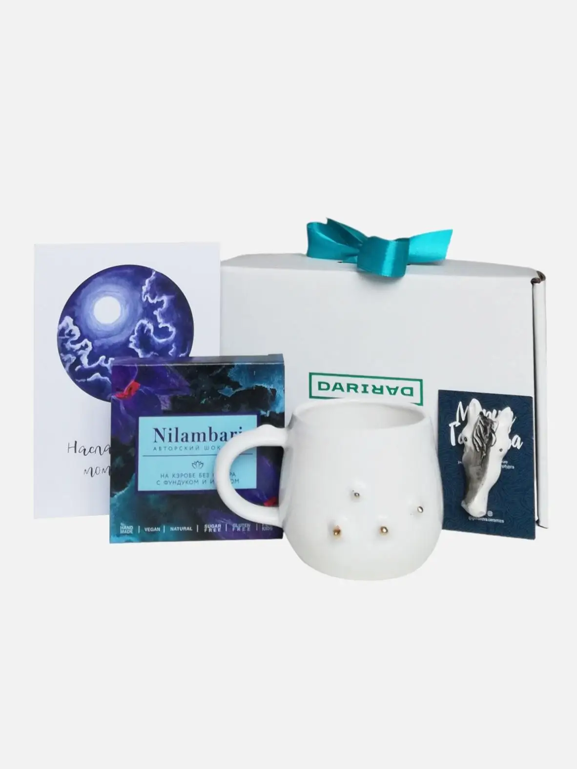 Подарочный набор с кружкой ручной работы, керамической брошью и шоколадом