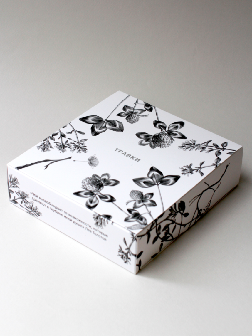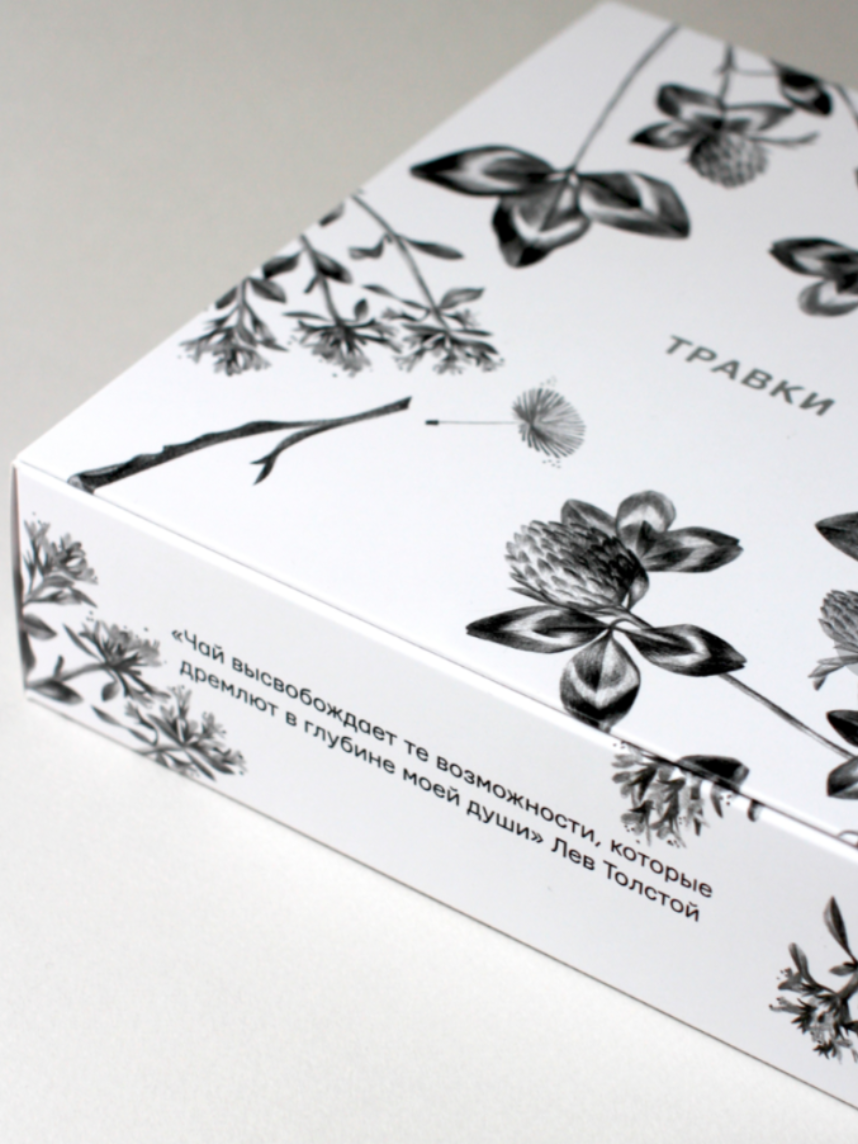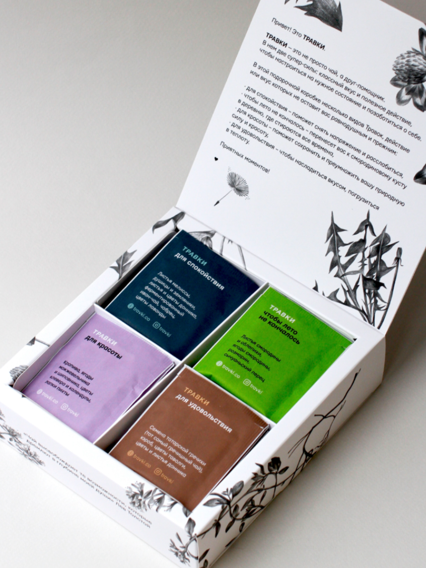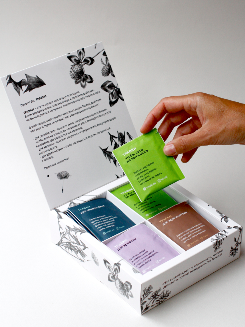 Набор, который приятно дарить и получать: ассорти классно впишется в тёплые вечера с гостями или встречу с коллегами. Упаковку украшают фирменные иллюстрации растений и переливающийся серебряный логотип. Внутри 40 пакетиков: по 10 каждого вкуса. А чтобы они точно не убежали из коробки, крышка плотно закрывается на магнит. К новогодним праздникам мы упаковали ассорти в серебристую ленту с биркой, которую можно подписать от себя. Что внутри: Травки для спокойствия — поможет снять напряжение и расслабиться, Травки чтобы лето не кончалось — перенесет вас к смородиновому кусту в деревню, где стираются все времена, Травки для красоты — поможет сохранить и преумножить вашу природную силу и красоту, Травки для удовольствия — чтобы насладиться вкусом, погрузиться в теплоту. Возможны слегка заметные изменения во вкусе чая в зависимости от фасовки.