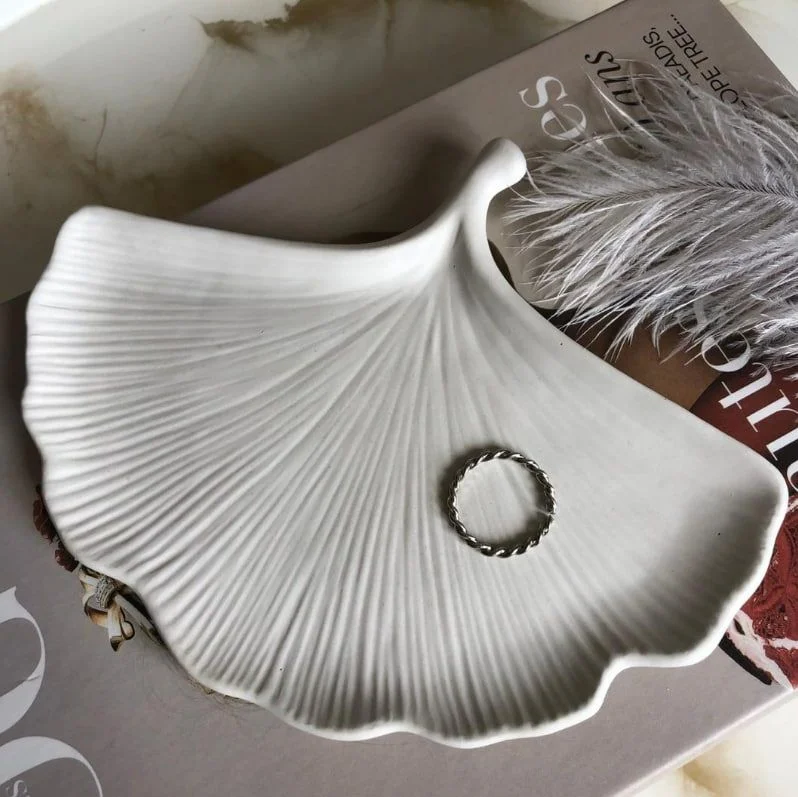 Оригинальная гипсовая подставка ручной работы в виде листа дерева гингко. Может использоваться в качестве подставки под украшения, а также выполнять роль стильного декора или подсвечника, фотофона или реквизита при предметной съемке. Можно использовать как ключницу.