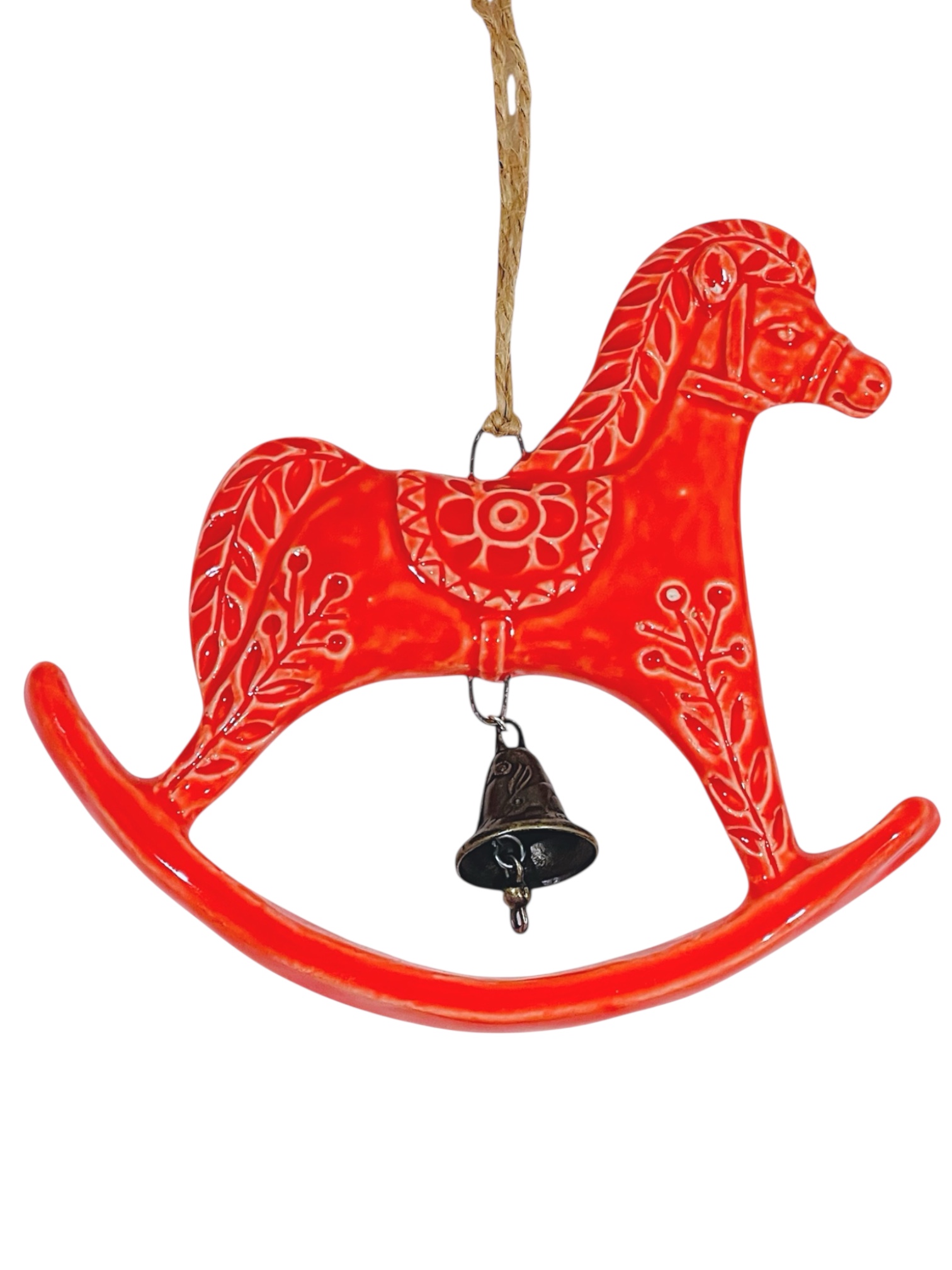 Подвес плоский керамический ручной работы «Лошадка-качалка с колокольчиком», красный, 13 см