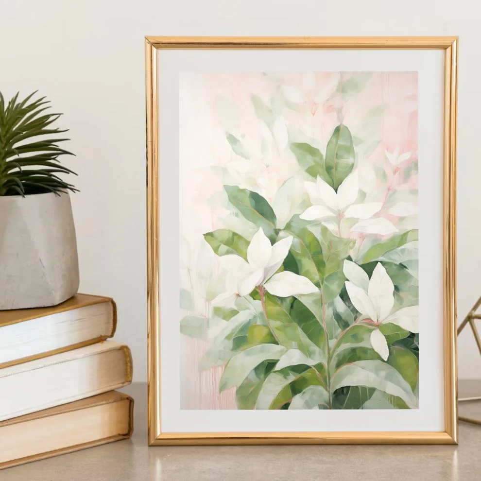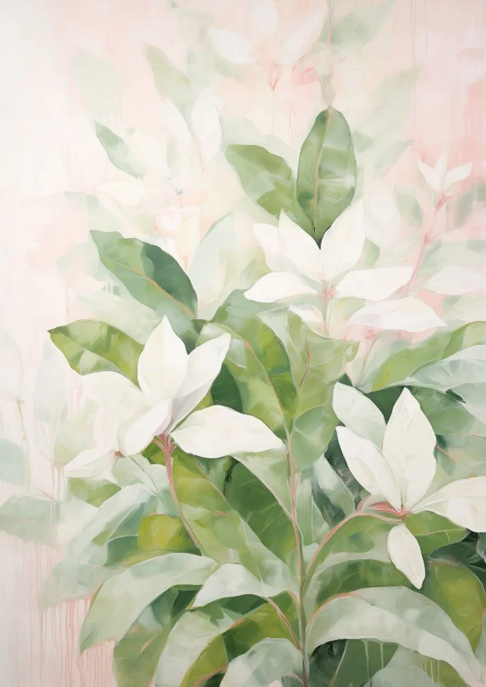 Авторский интерьерный постер с акварельным изображением белых цветов в зеленой листве в светлых тонах.