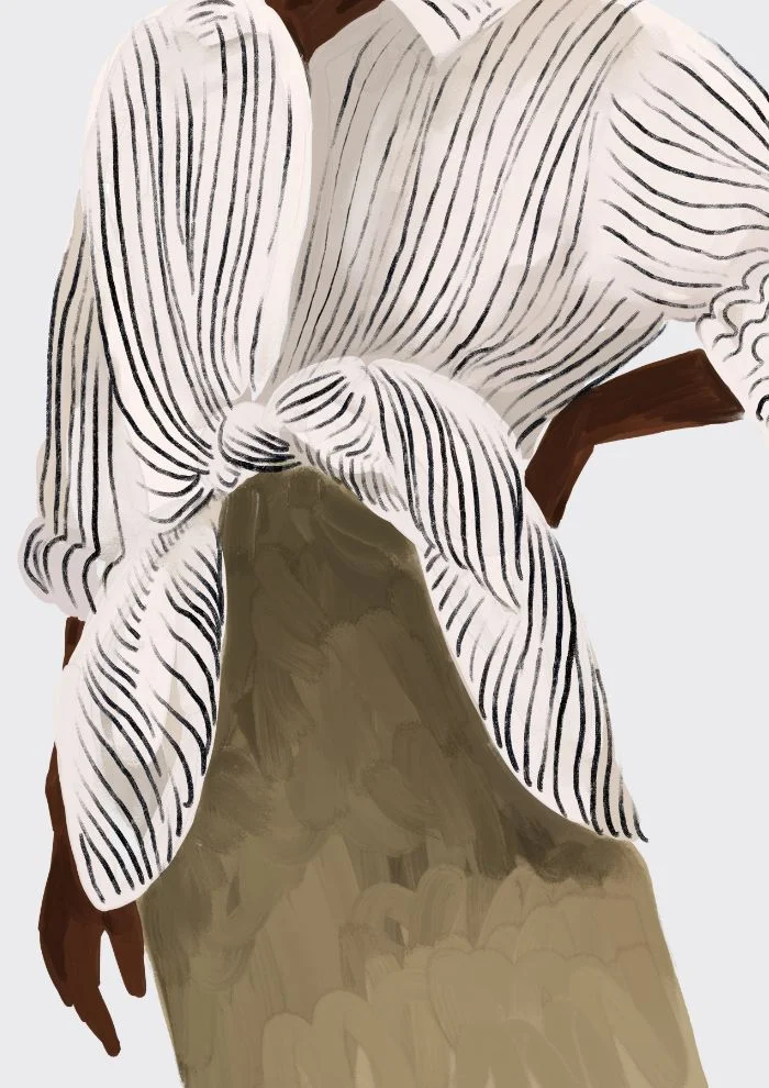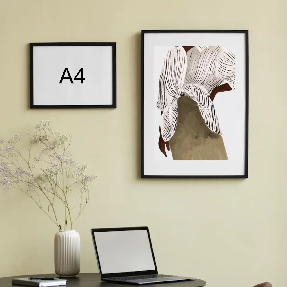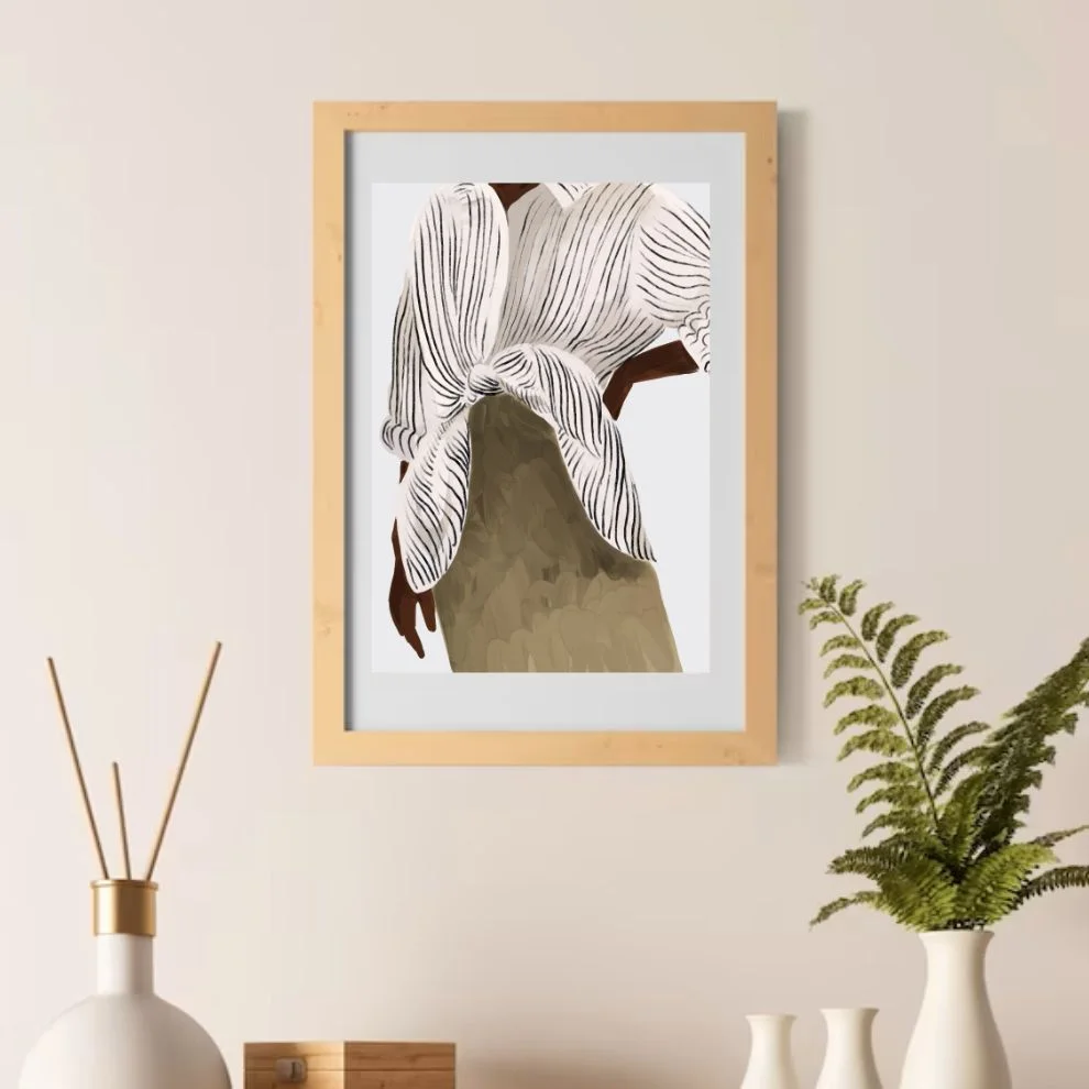 Авторский интерьерный постер с изображением фигуры девушки в белой блузе и юбке песочного цвета.
