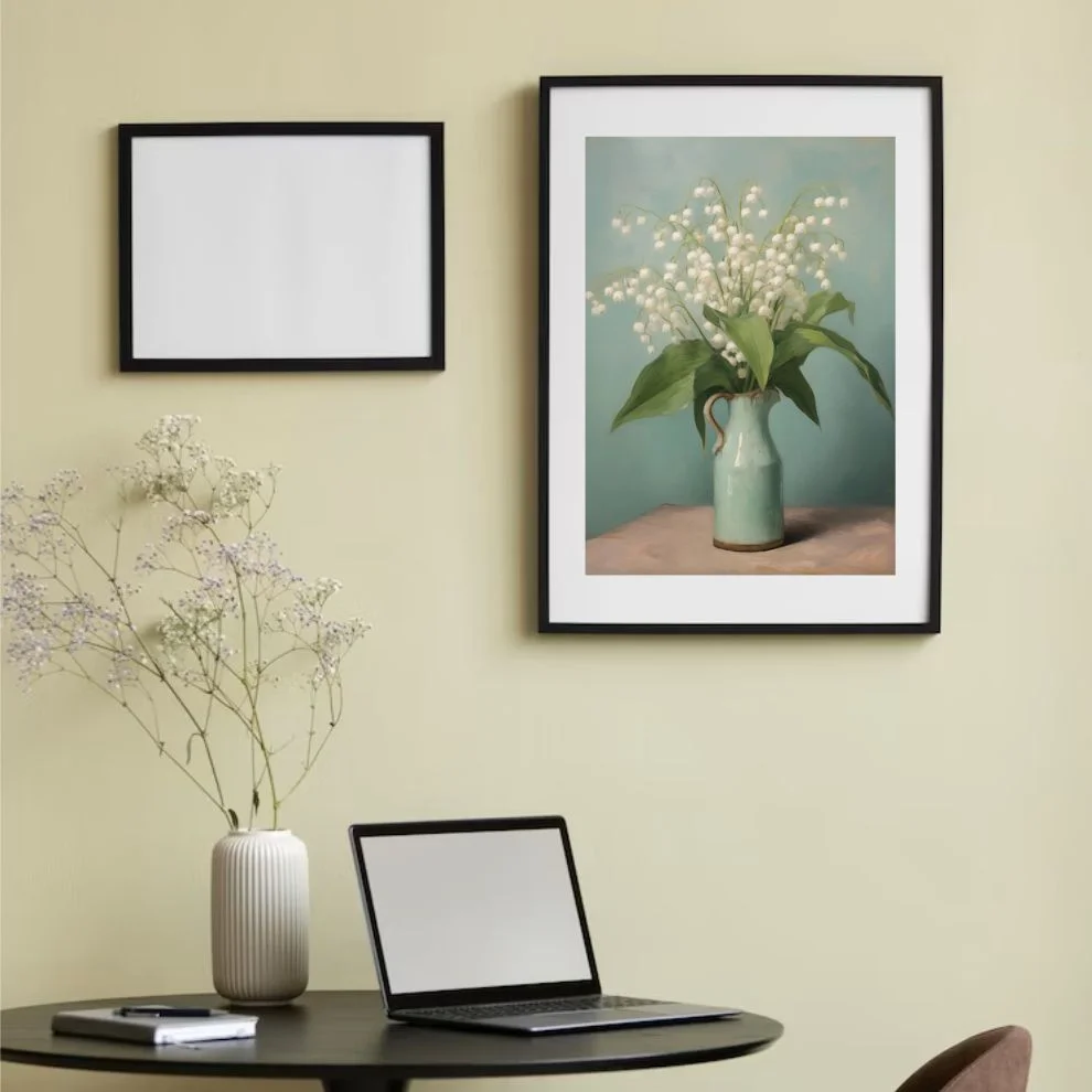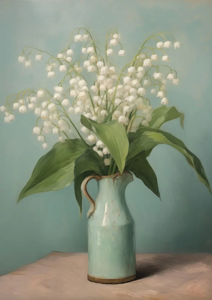Нежный интерьерный постер с изображением букета ландышей, стоящих на столе в голубом кувшине.