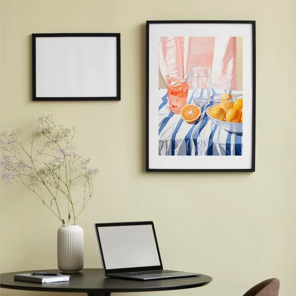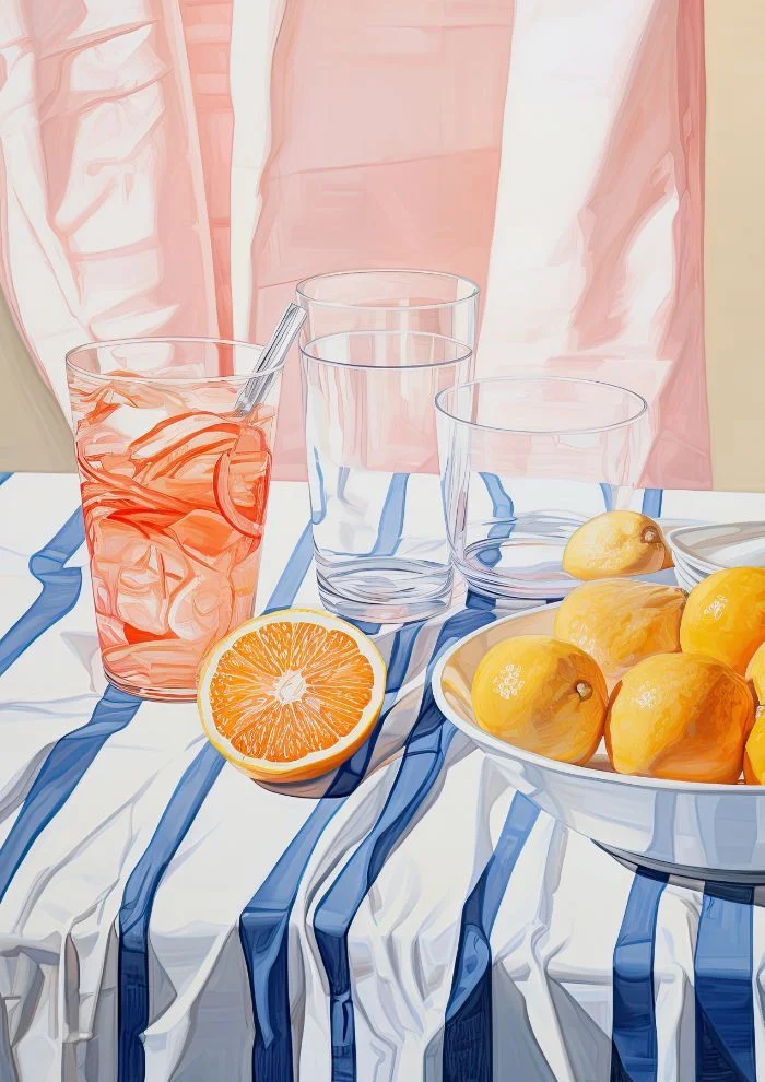 Яркий интерьерный постер с натюрмортом - лимонадом из цитрусовых, апельсином и лимонами на полосатой скатерти.
