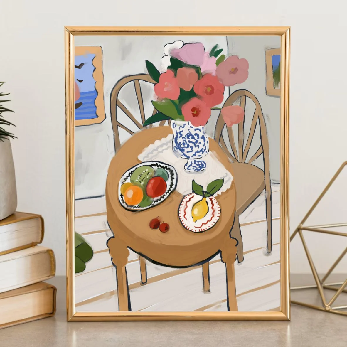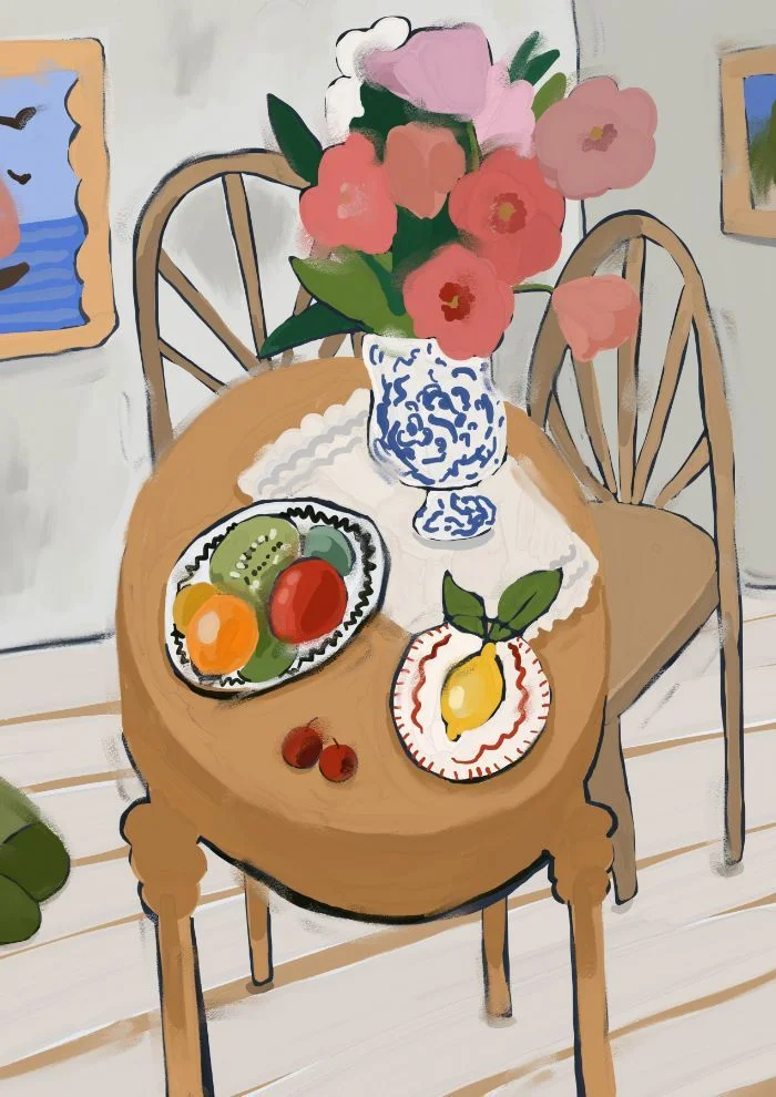 Авторский интерьерный постер с изображением небольшого стола с фруктами и цветами.