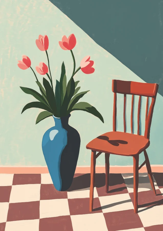 Яркий интерьерный постер с изображением вазы с тюльпанами и стулом.