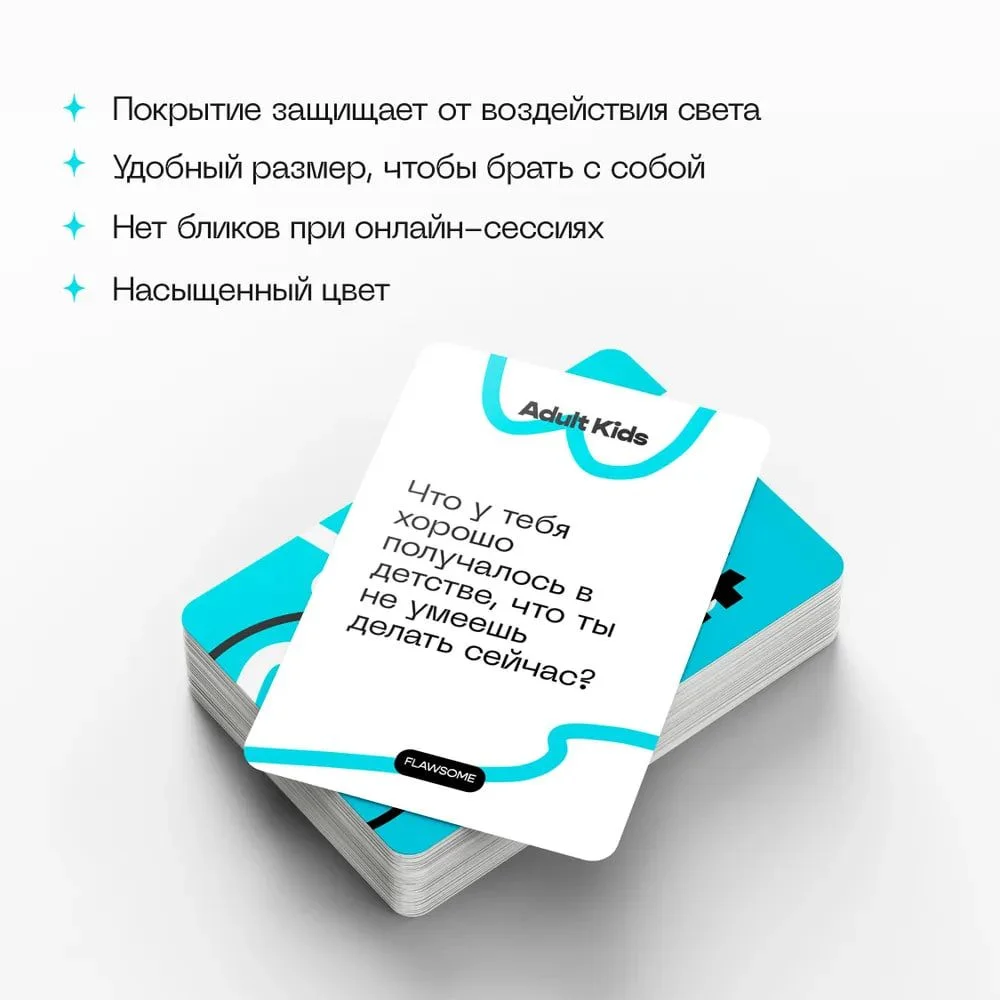 Adult Kids - набор из 50 разговорных карточек, побуждающих вспомнить и проанализировать события детства, чтобы найти связь с нынешними установками и моделями поведения. Карты с вопросами о принятии себя, проживании сложных эмоций в детстве. Разговорные карточки может использовать в своей работе как профессиональный психолог, так и человек без психологического образования в целях самопознания. Психологическая игра может применяться как в индивидуальной работе, так и в групповой.