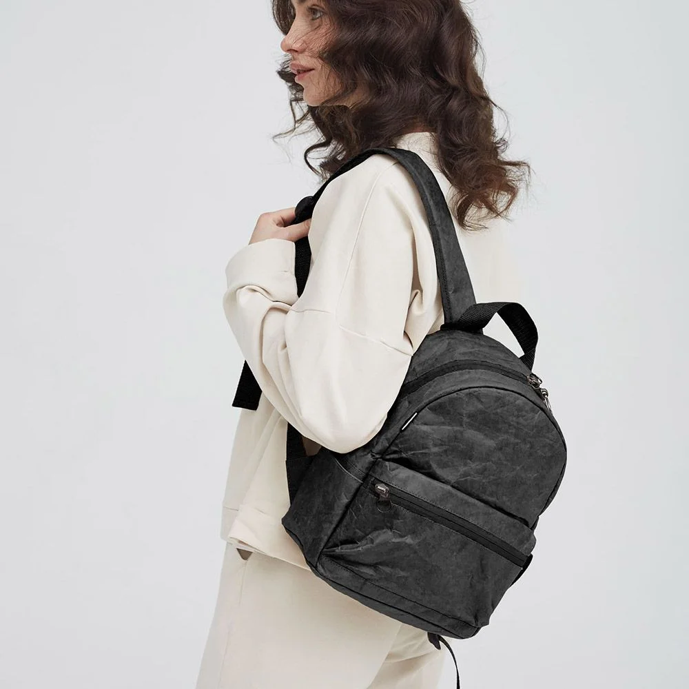 Рюкзак Latifa Black выполнен из необычного Крафт материала Tyvek (Тайвек), который устойчив к дождю и снегу, его можно даже мыть в стиральной машине, в холодной воде. Материал ультра легкий и прочный.