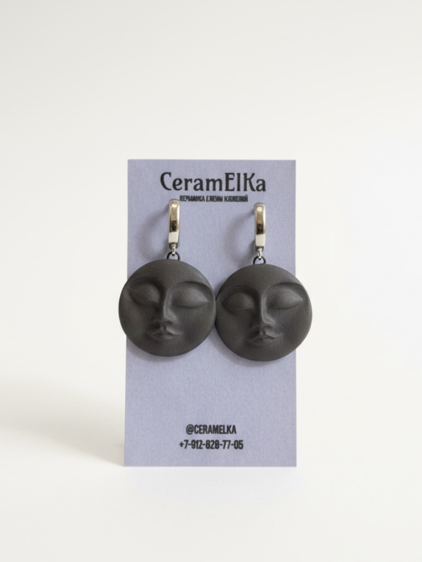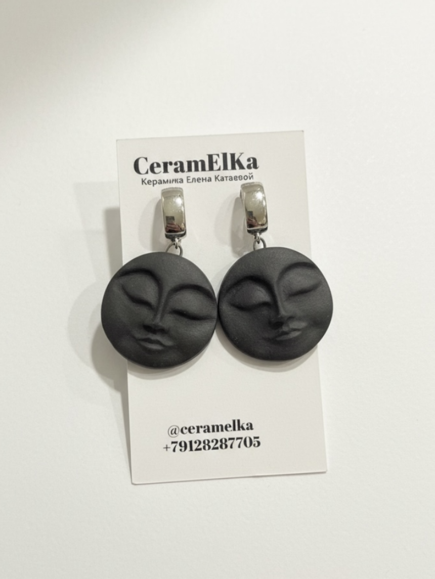 Серьги КерамЕлКа «Большие лица», фарфор, чёрные, матовые