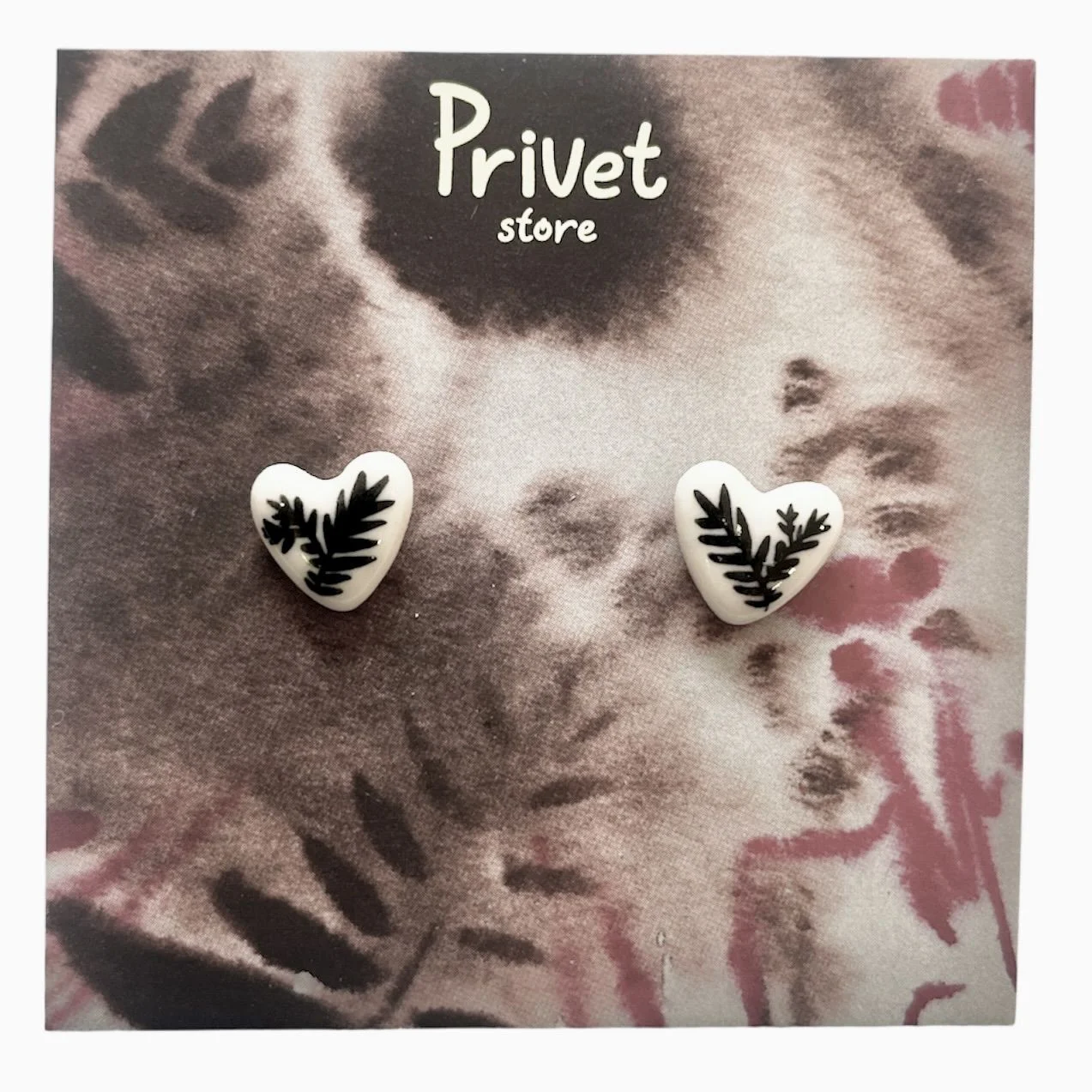 Керамические серьги гвоздики «Сердечки с чёрной веточкой » ручной работы. Производитель - московский бренд «Privet Store».
