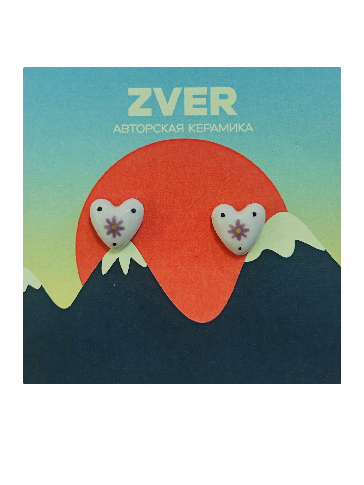 Керамические серьги гвоздики «Сердечки с серым цветочком» ручной работы. Производитель - московский бренд «Privet Store».