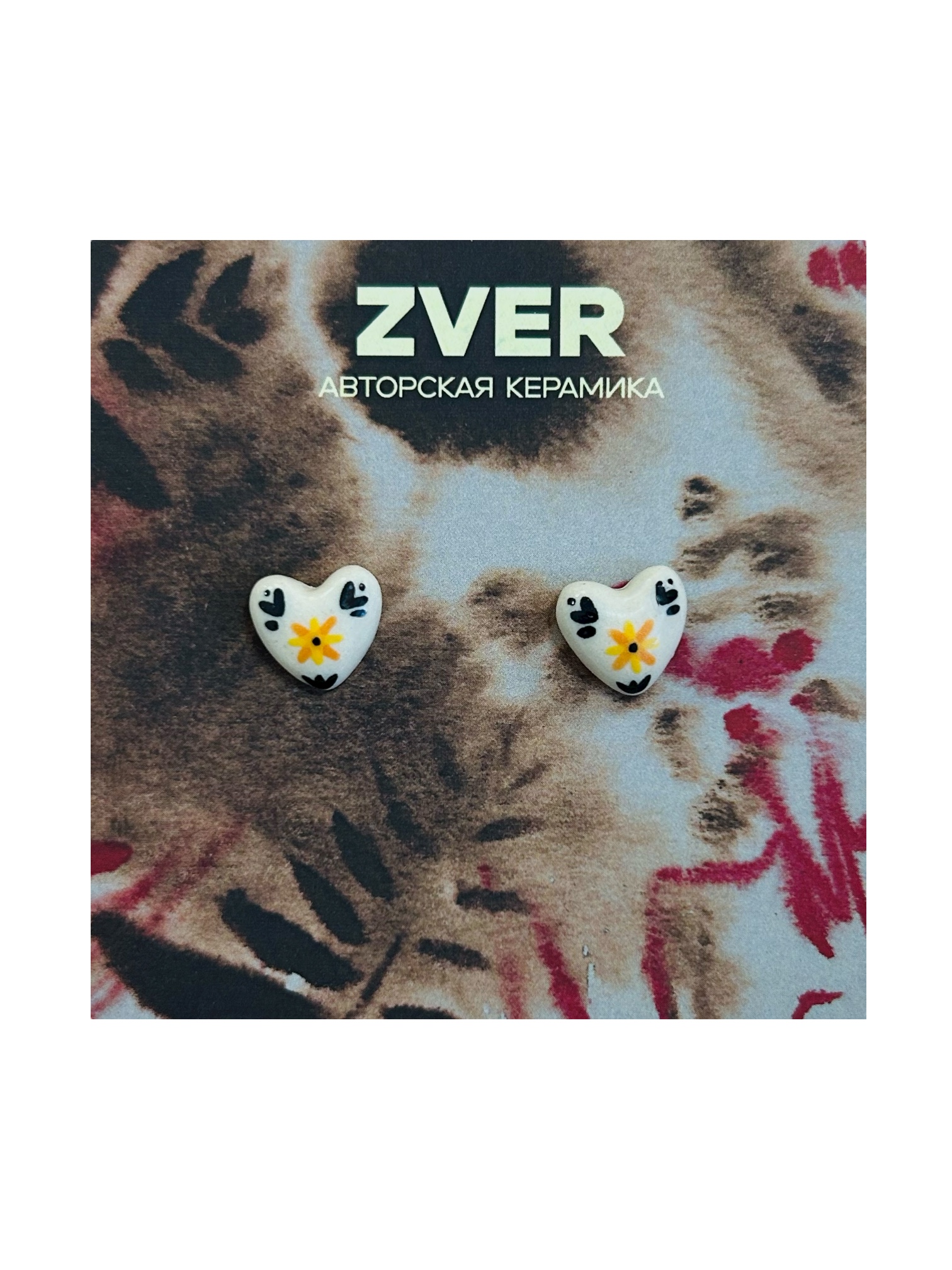Керамические серьги гвоздики «Сердечки с жёлтым цветочком» ручной работы. Производитель - московский бренд «Zver».