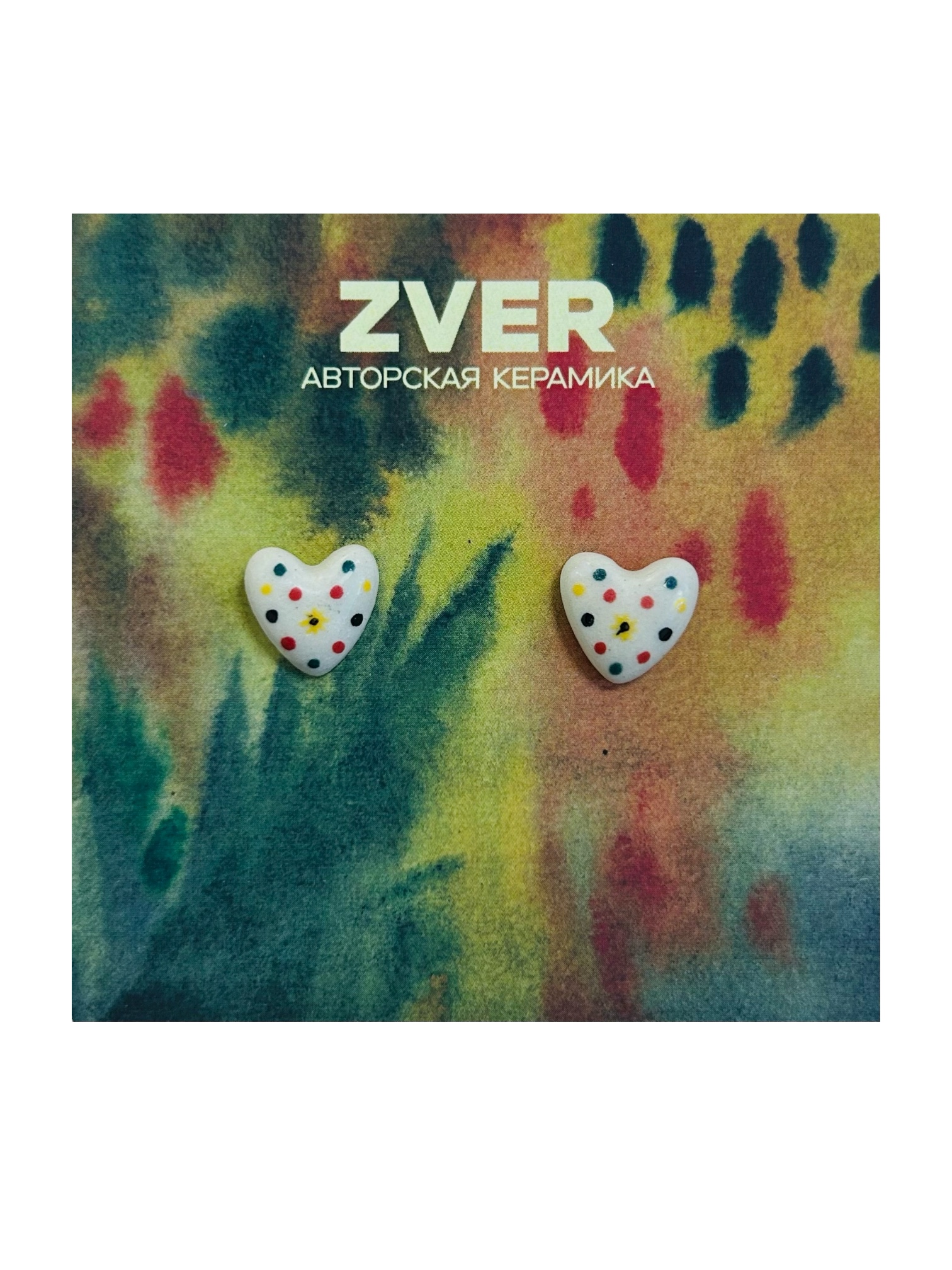 Серьги-гвоздики ручной работы «Сердечко с жёлтым цветочком и точками», белые, керамика. Производитель - московский бренд «Zver».