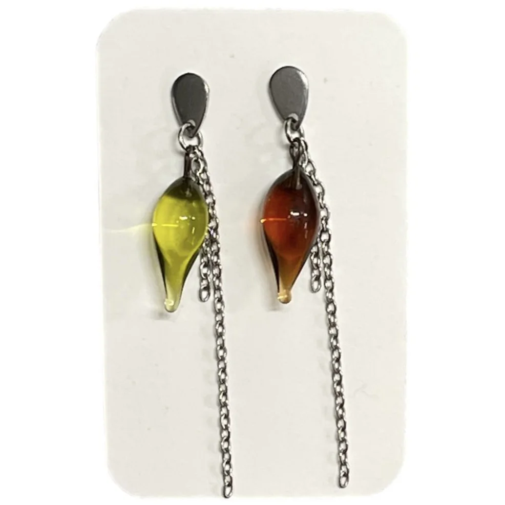 Серьги-гвоздики с цепочкой зеленые и коричневые листочки ручной работы от бренда Kerko glass.