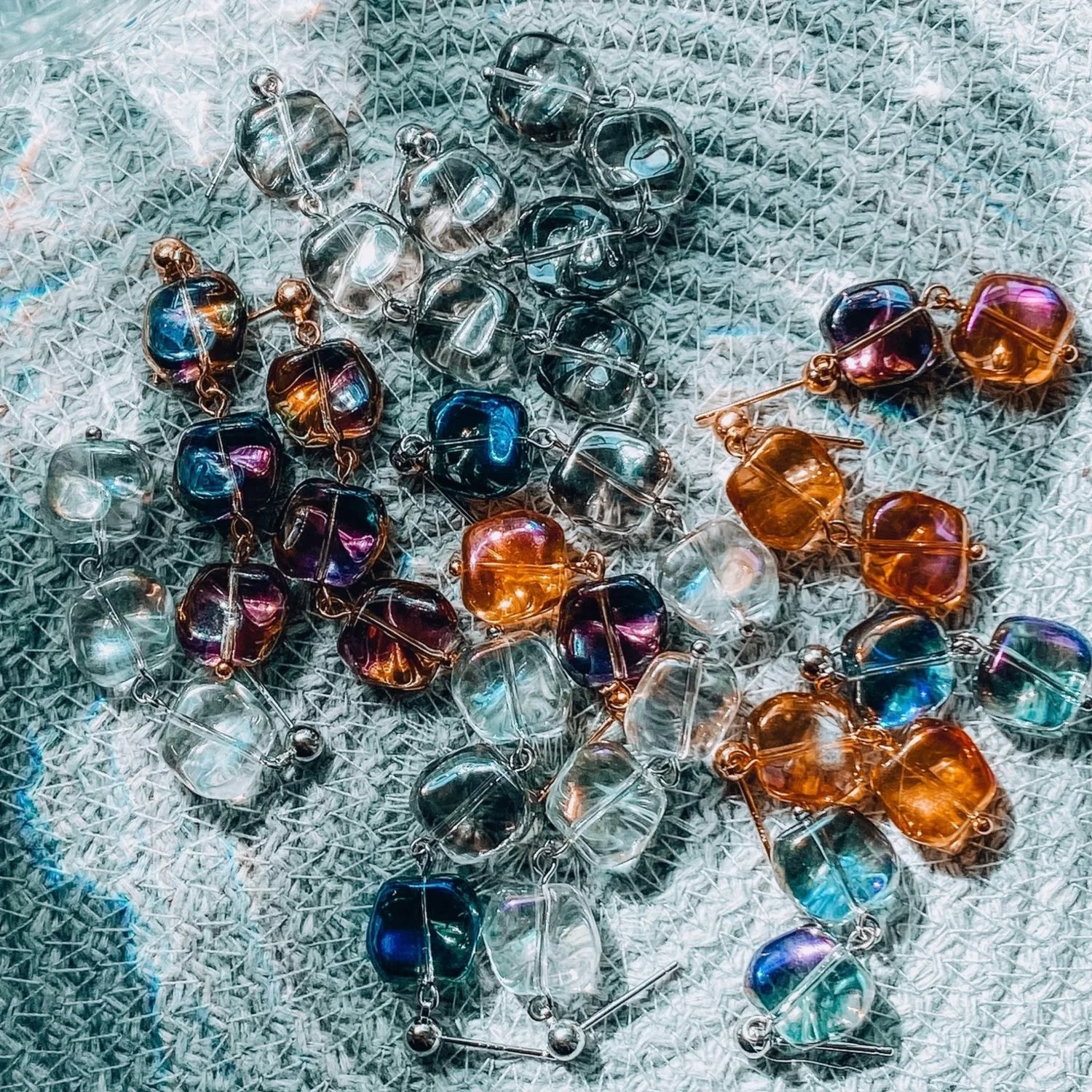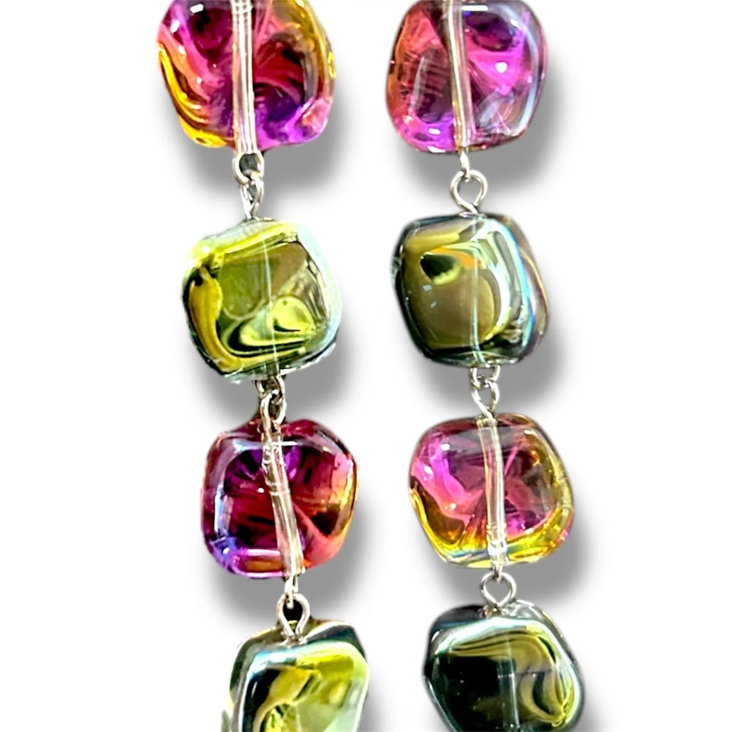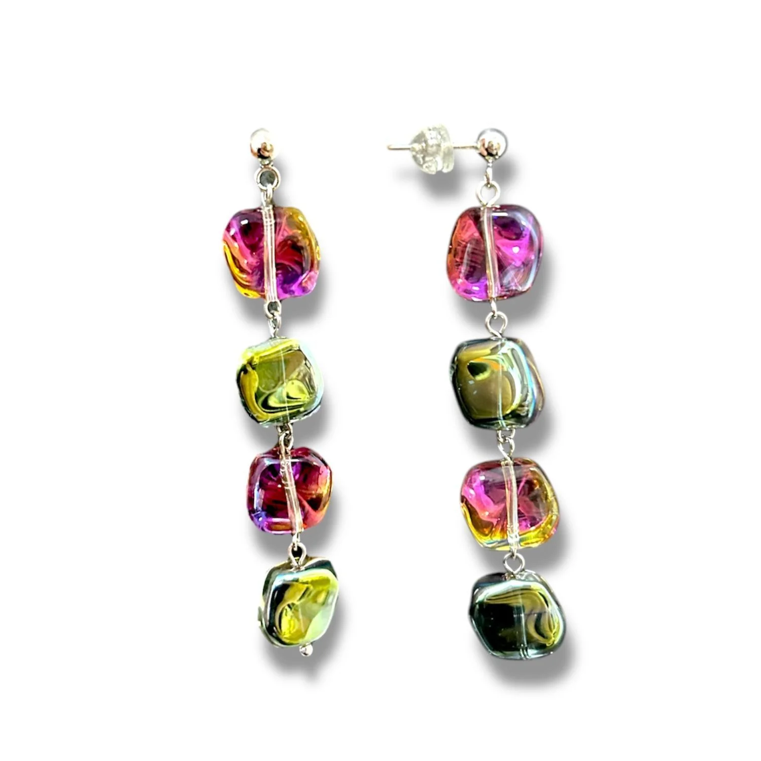 Серьги «Ice» красно-зелёного цвета, выполненный из ювелирного сплава и художественного стекла. Блестят на солнце и похожи на замерзшие капли росы.
