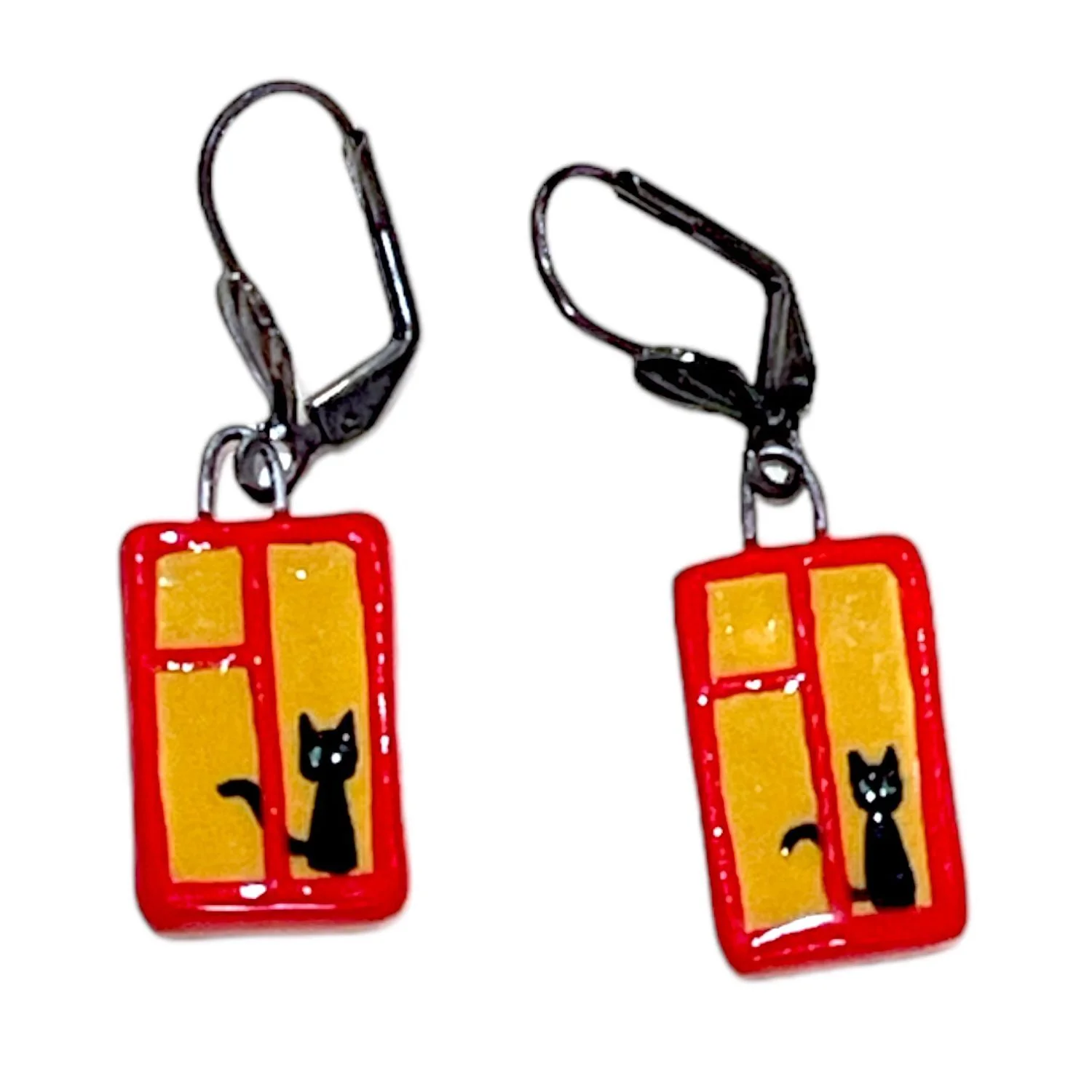 Серьги-конго Боттери керамика «Чёрный кот за окном», керамика, красные
