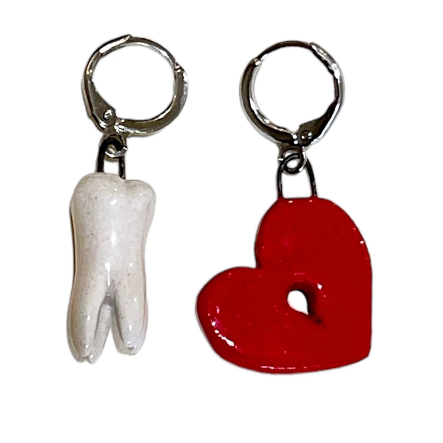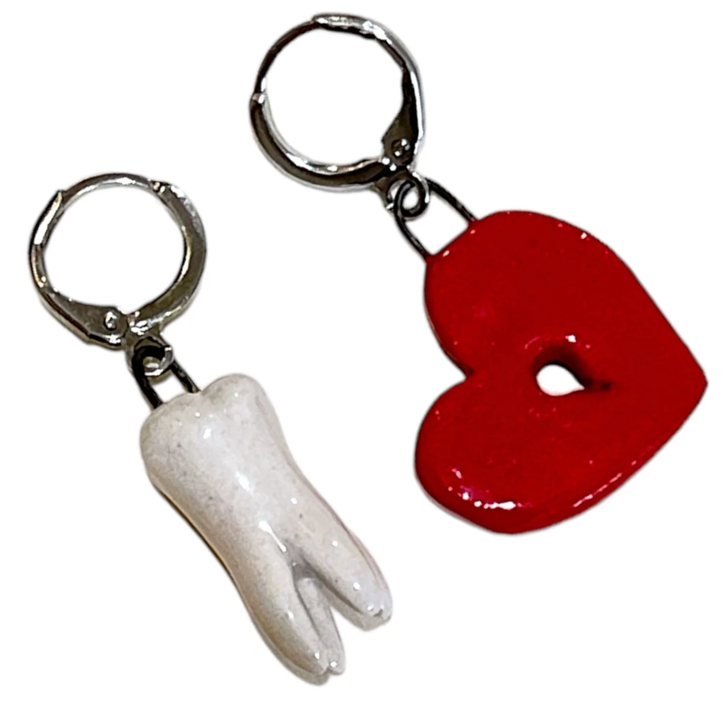Серьги конго керамические ручной работы «Зуб и красное сердце».
