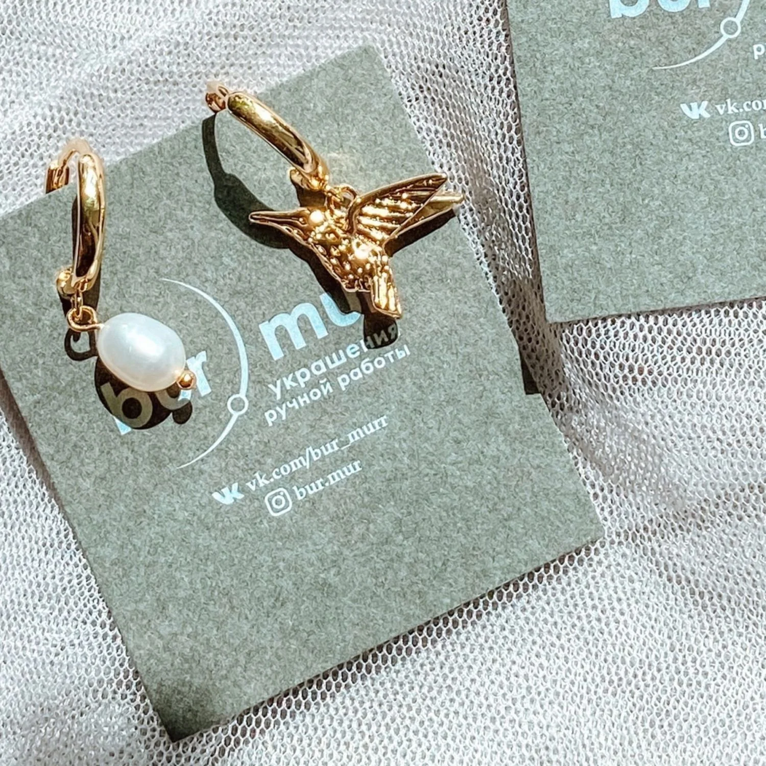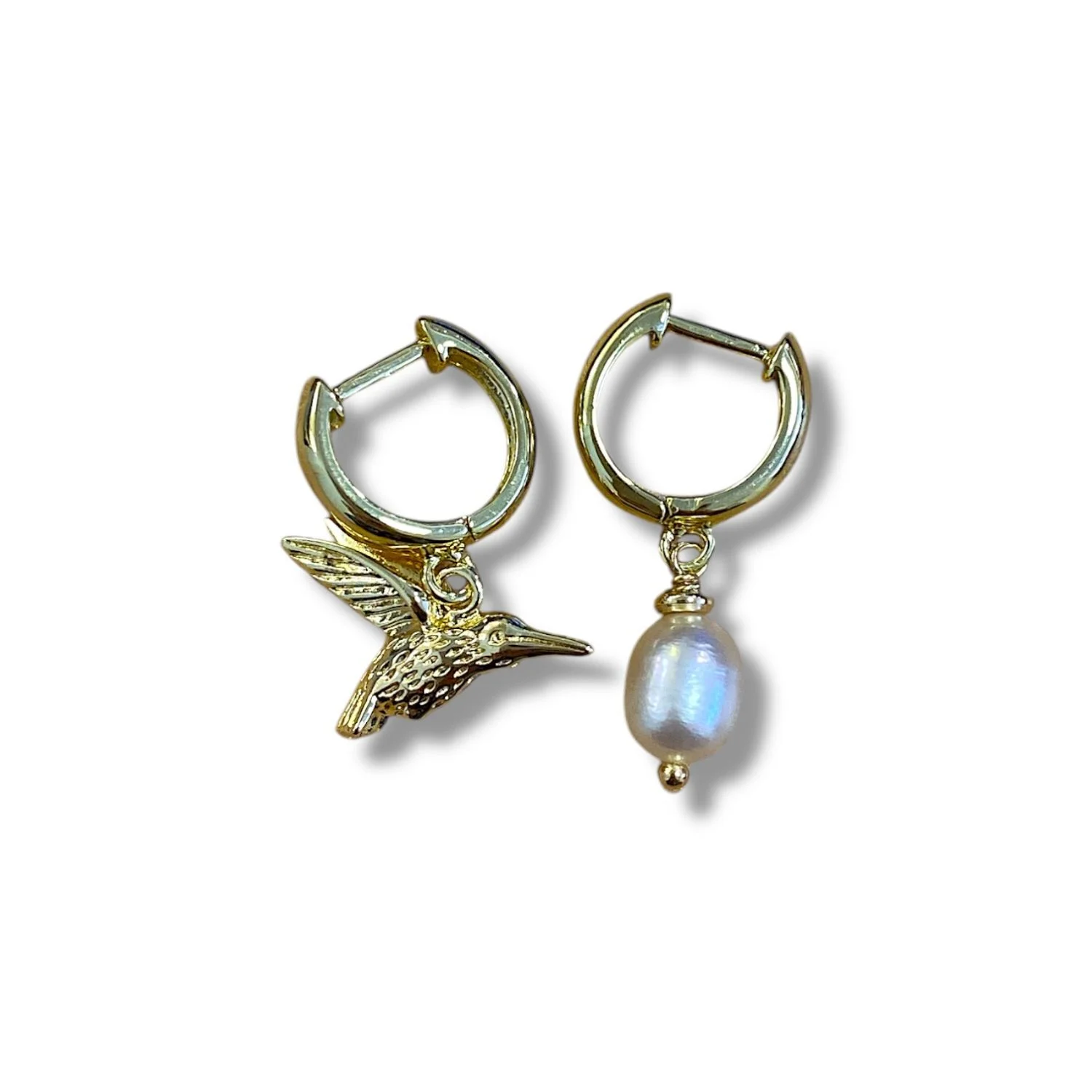 Серьги-конго с подвесками из жемчуга и птичек Колибри, выполненными из латуни с позолотой.