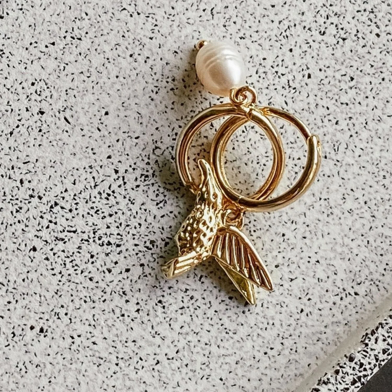 Серьги-конго «Колибри», позолота, латунь, жемчуг