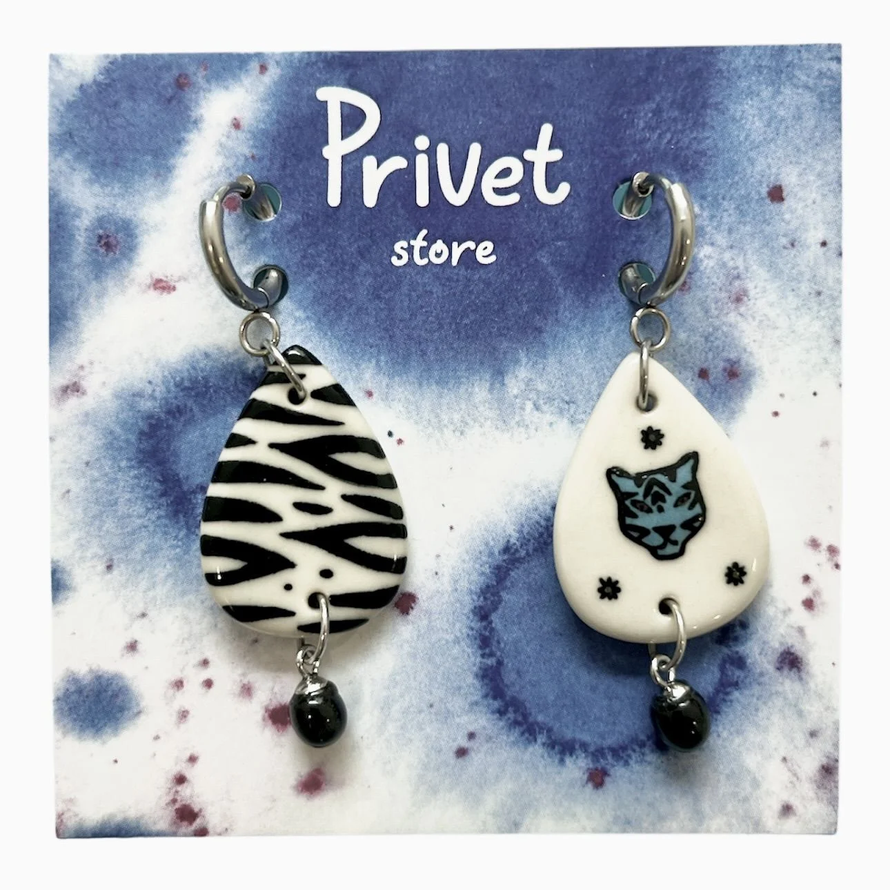 Керамические серьги висячие «Принт зебра и синий тигр» ручной работы. Производитель - московский бренд «Privet Store».