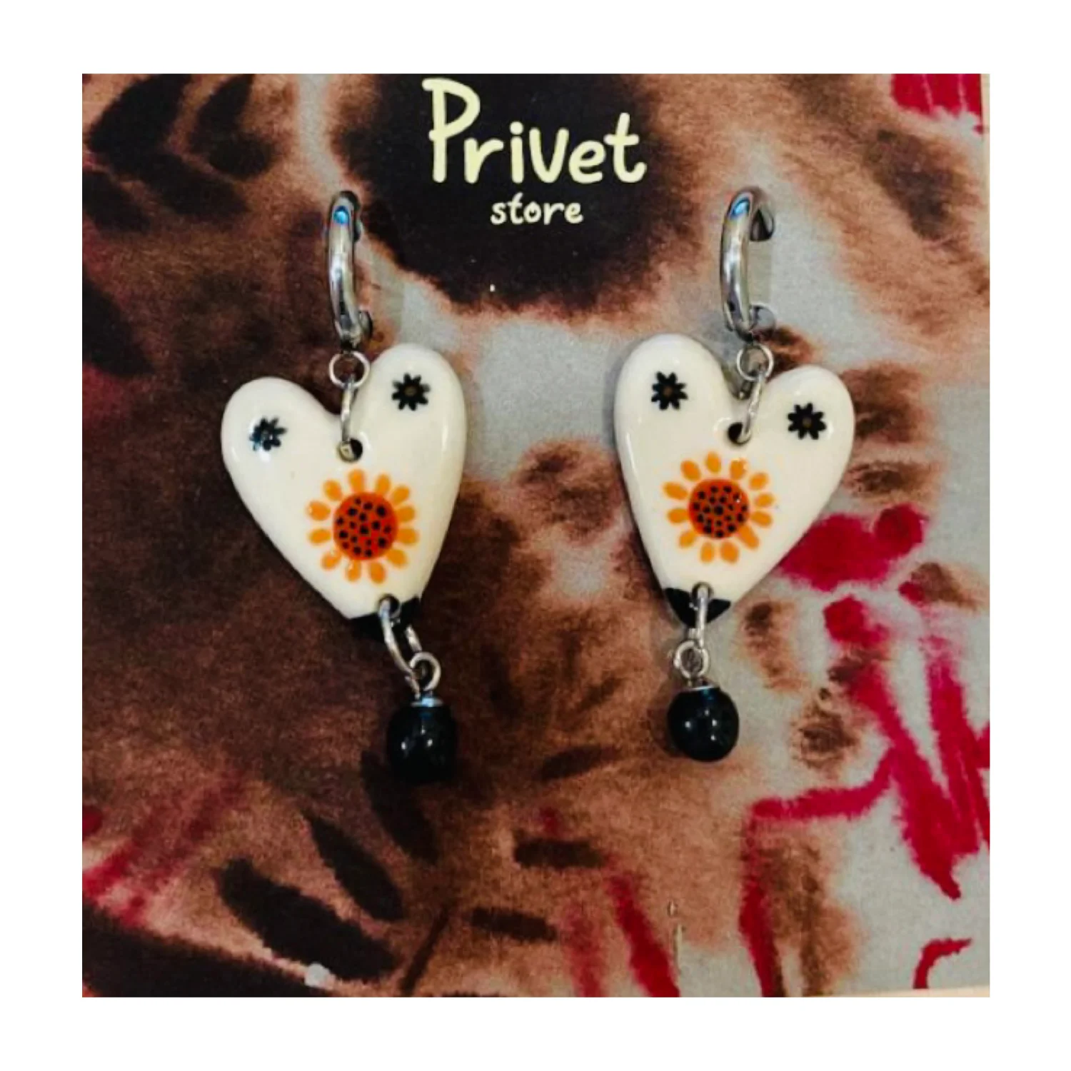 Серьги-конго Звер с бусиной «Подсолнухи», керамика, белый