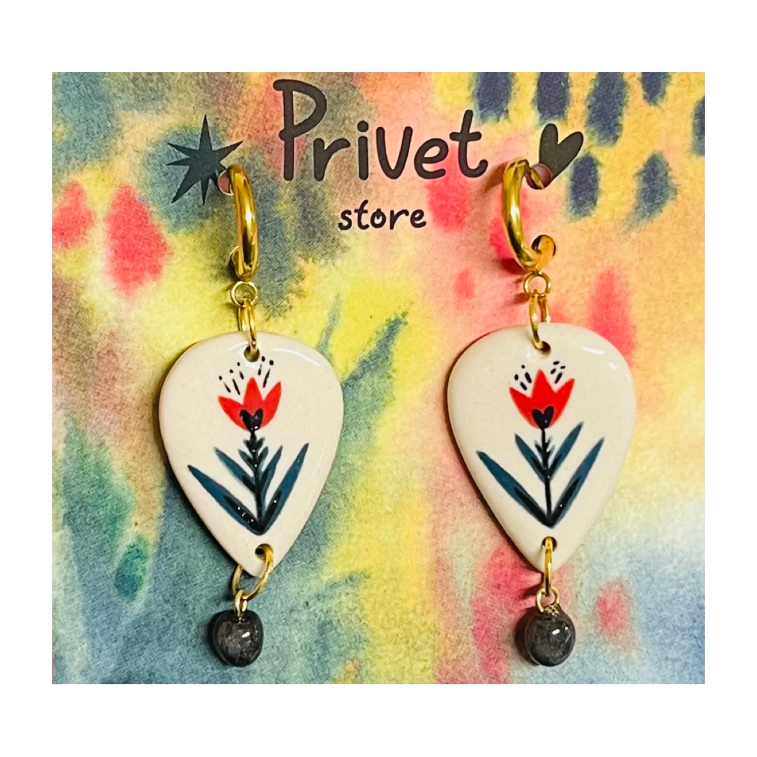 Серьги-конго ручной работы Звер с бусиной «Тюльпаны», керамика