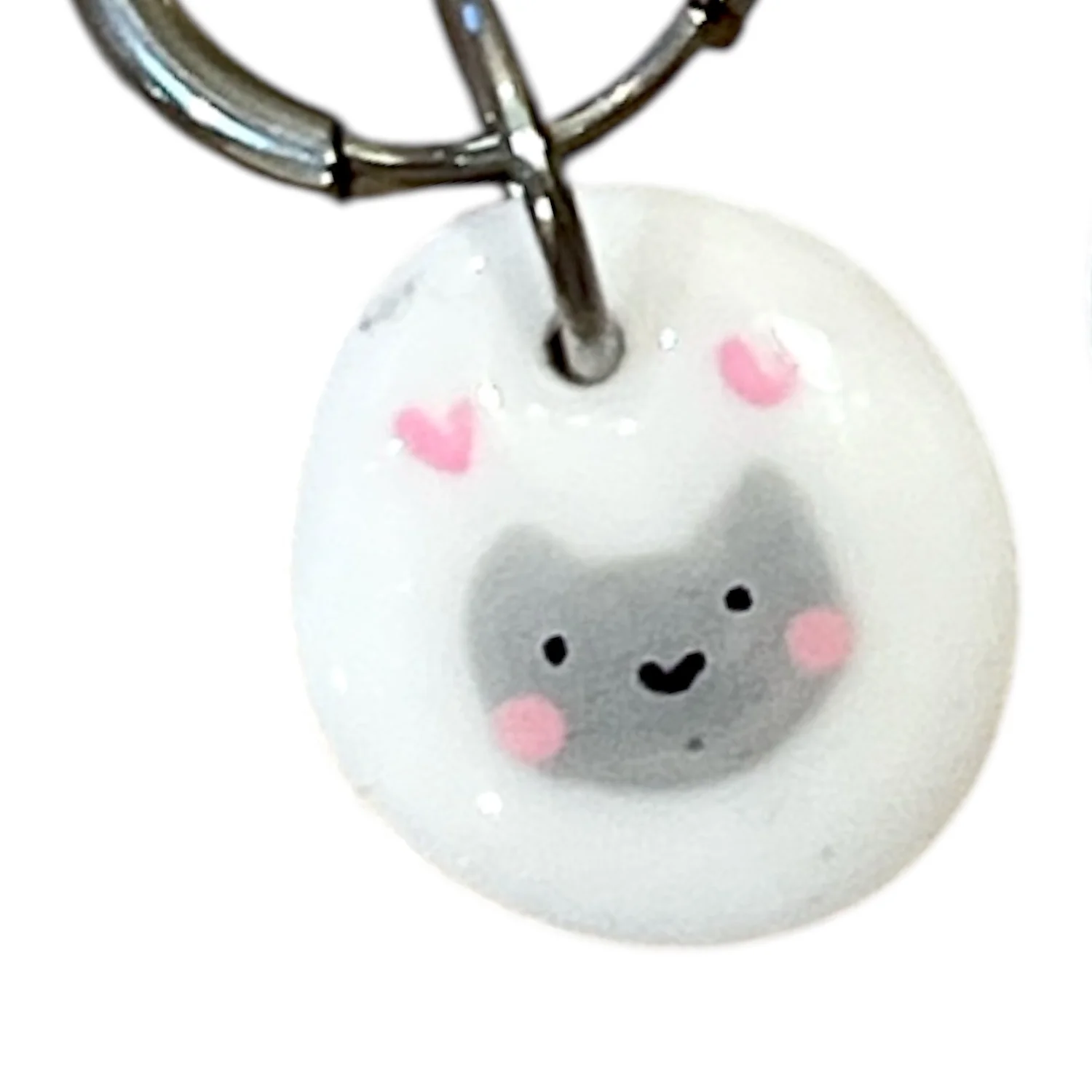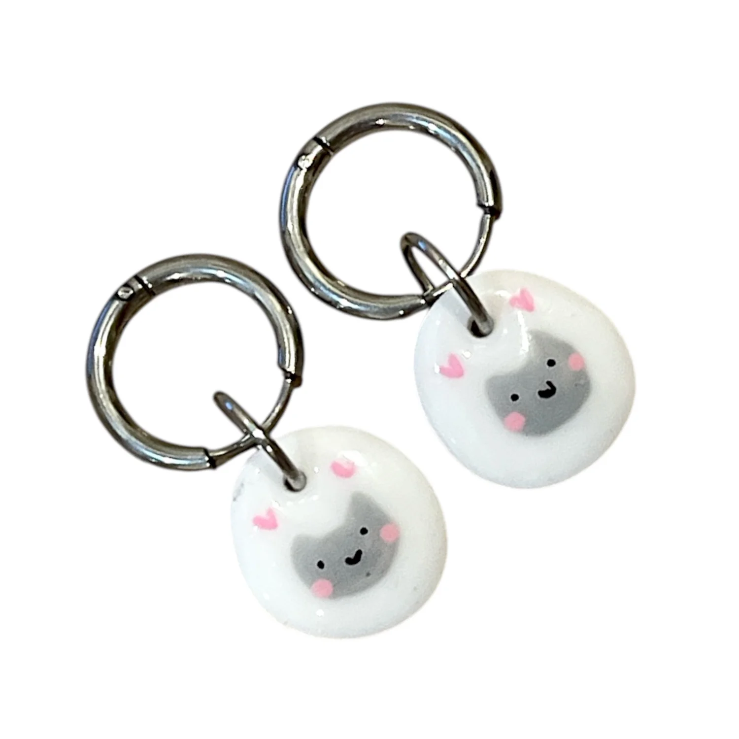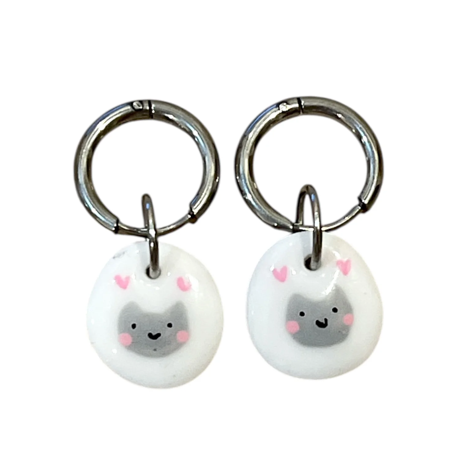 Серьги-конго Радость Рядом с овальной подвеской «Котик с сердечками», полимерная глина, белые