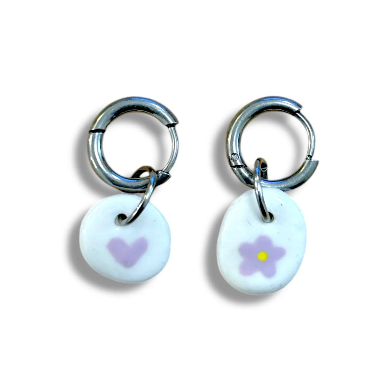 Серьги-конго Радость Рядом «Сиреневый цветочек с сердечком», полимерная глина, белые