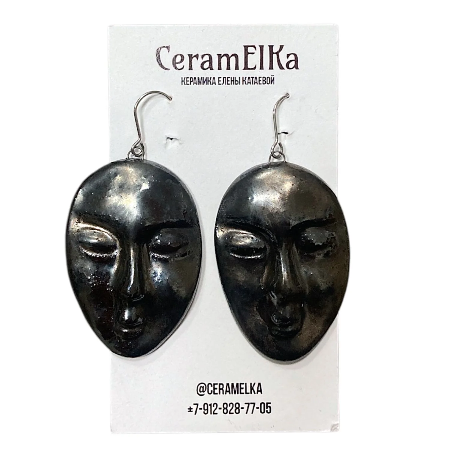 Серьги КерамЕлКа «Лица» большие, фарфор, чёрные, металлик