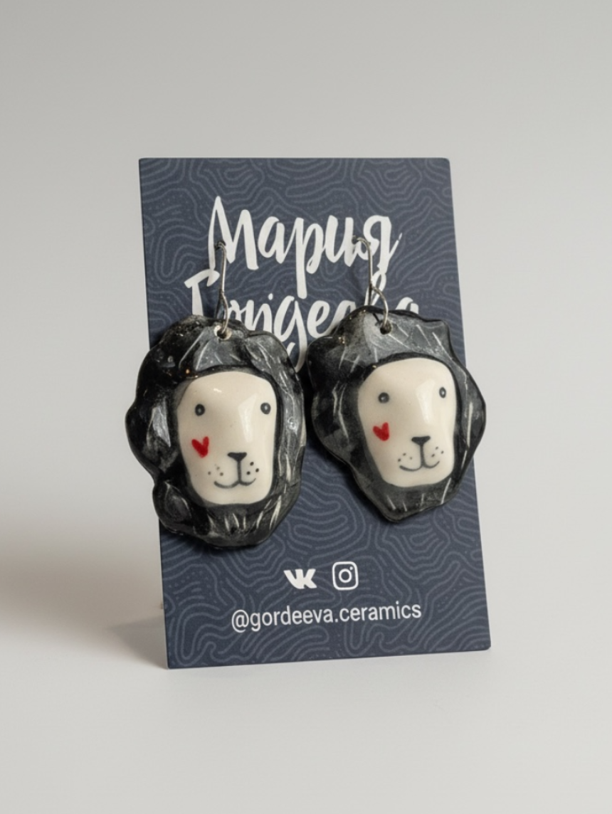 Керамические ассиметричные составные серьги в виде львов от петербургского бренда Gordeeva ceramics.