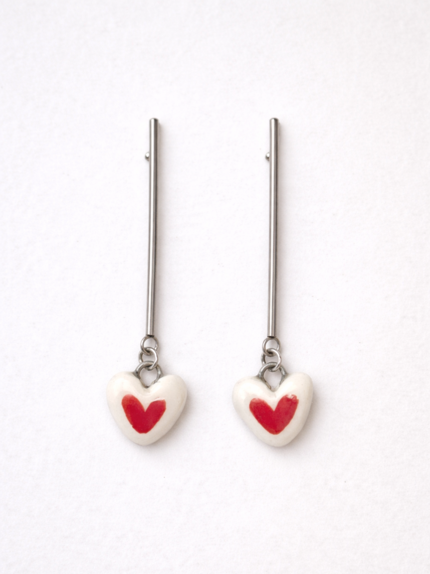 Серьги на длинной петле Сердечки, керамика, красно-белые