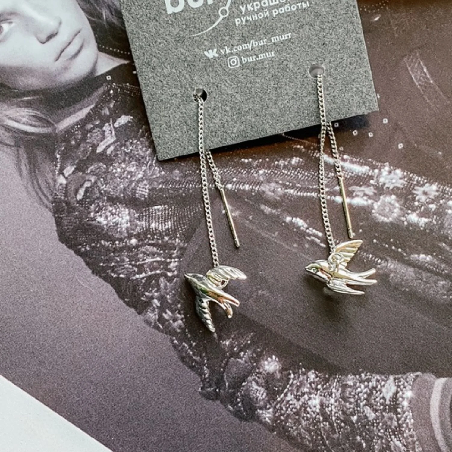 Серьги-протяжки Бур.Мур «Ласточки», родированная латунь