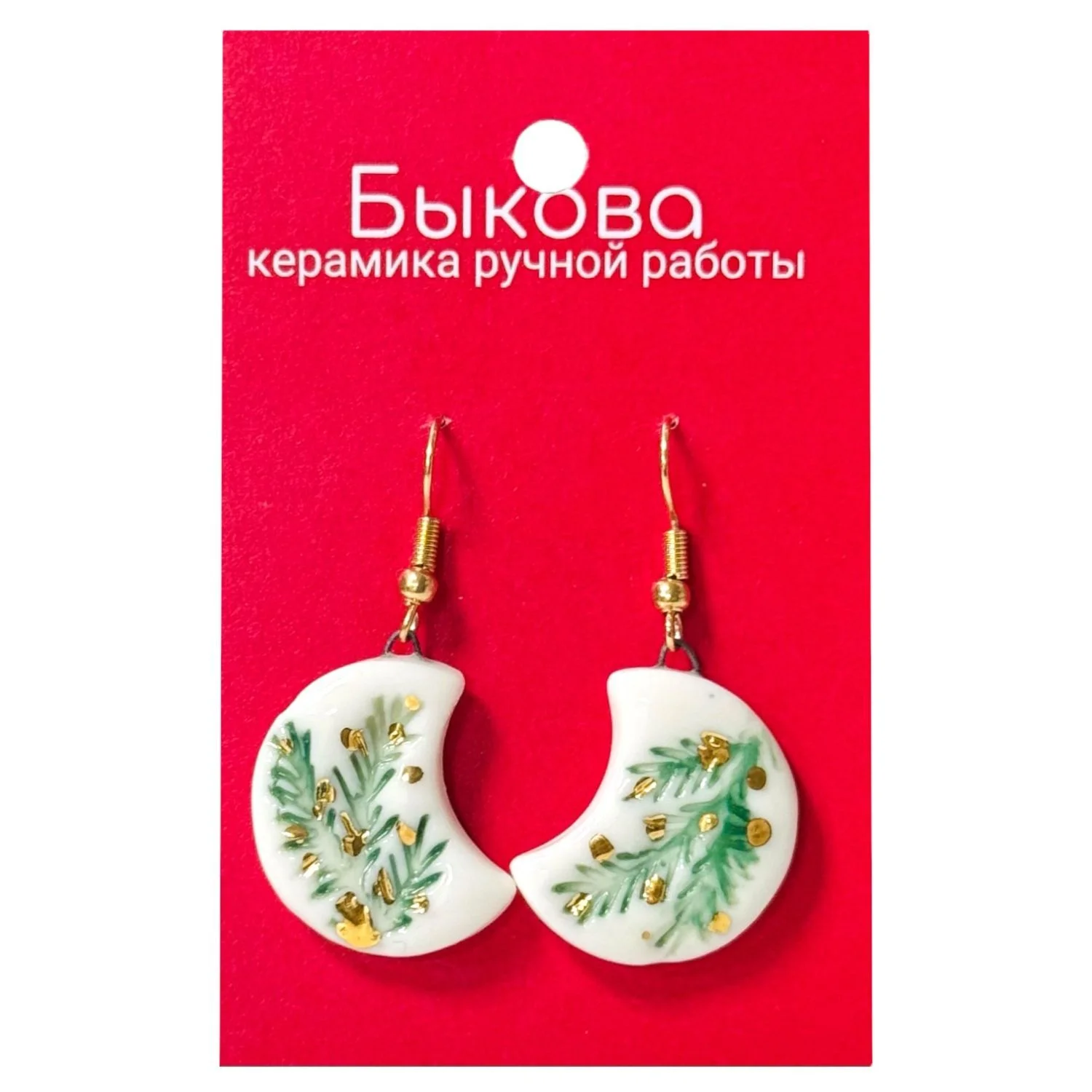 Серьги ручной работы Быкова керамика «Еловые ветви»‎, полные полумесяцы, фарфор