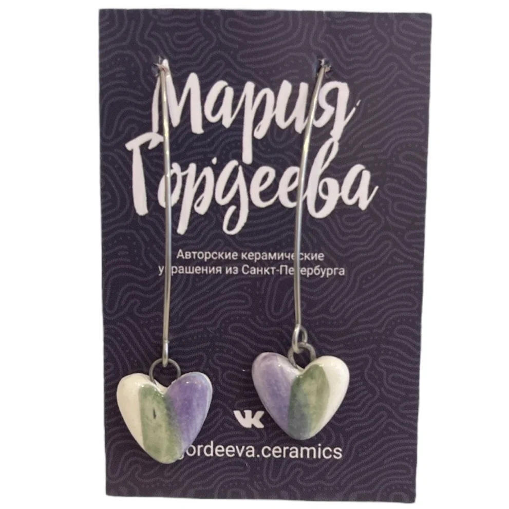 Серьги Мария Гордеева Сердечки, на длинной петле, керамика, фиолетово-зелёные