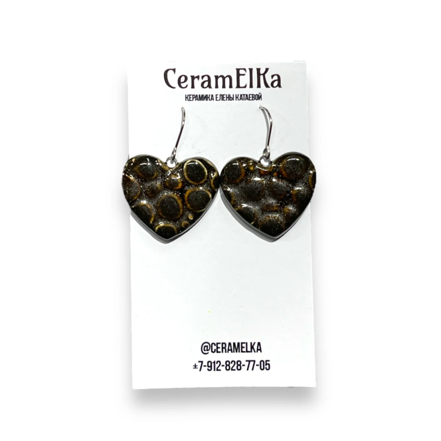 Серьги КерамЕлКа на петле Сердца с пузырями, керамика, тёмно-коричневые