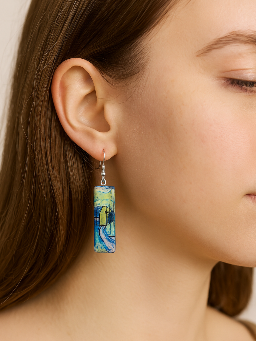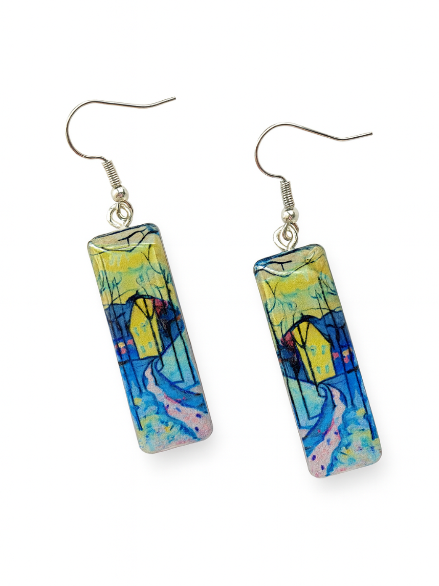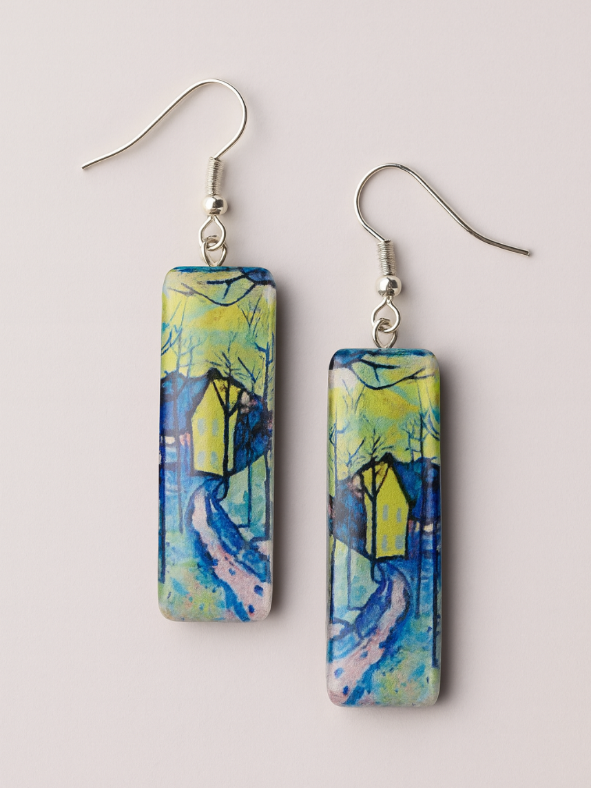 Серьги по мотивам знаменитой картины Кандинского «Зимний пейзаж» из дерева покрытые эпоксидной смолой от петербургской мастерской «Ручками-ручками».