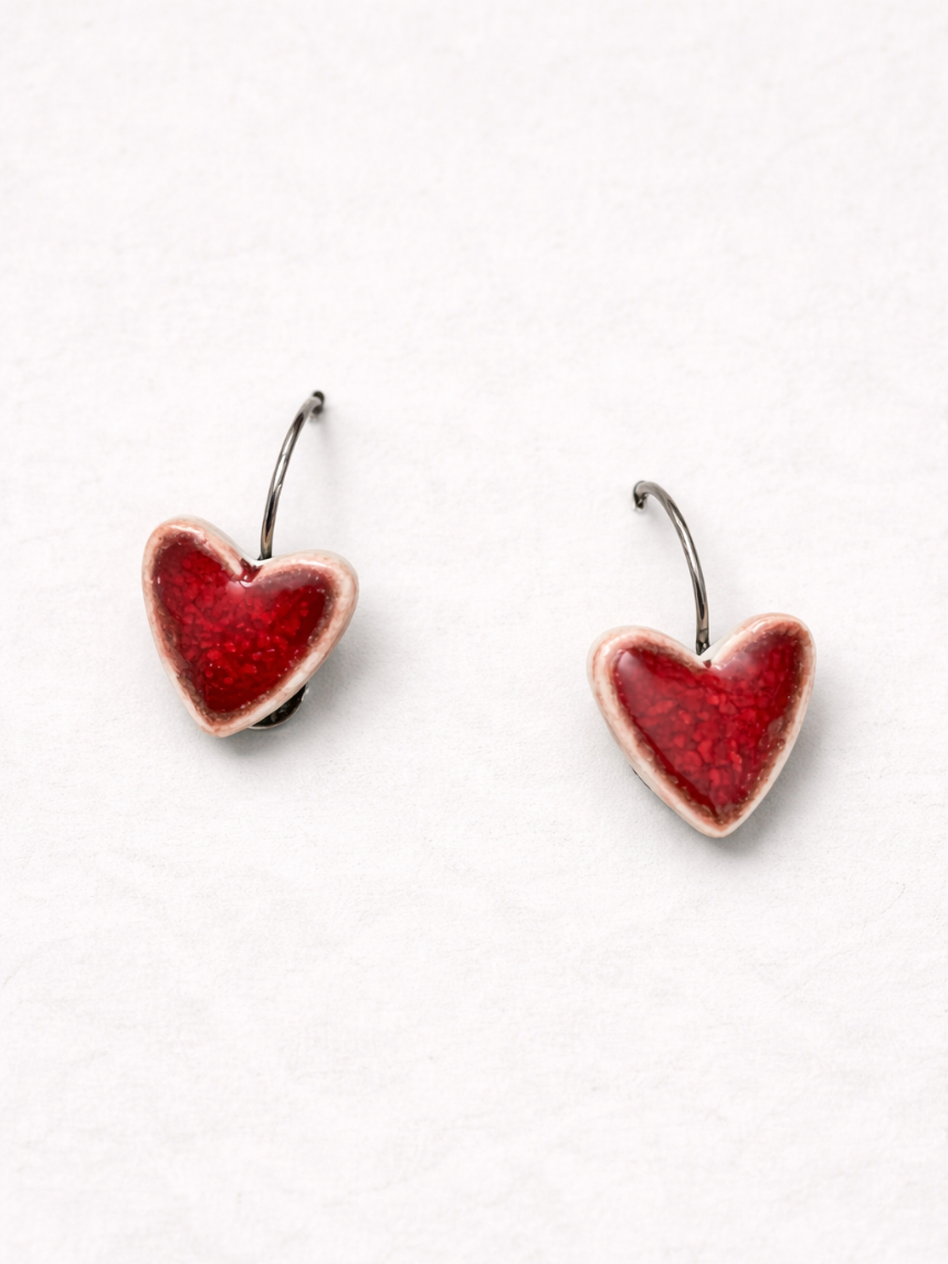 Пара аккуратных серёжек в виде сердечек красного цвета с эффектом потертости. Украшения изготовлены вручную дизайнером-керамистом Elizabeth Madar из Санкт-Петербурга.
