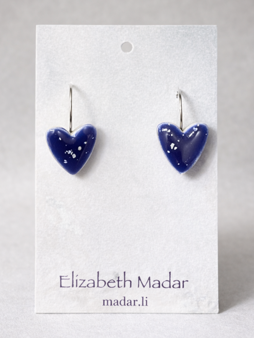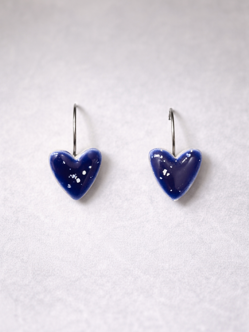 Пара аккуратных серёжек в виде сердечек тёмно-синего цвета с белыми брызгами. Украшения изготовлены вручную дизайнером-керамистом Elizabeth Madar из Санкт-Петербурга.