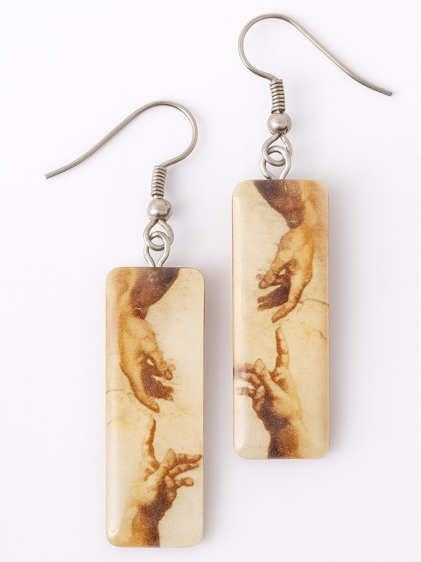 Серьги по мотивам знаменитейшей фрески Микеланджело "Сотворение Адама" из дерева покрытые эпоксидной смолой от петербургской мастерской "Ручками-ручками".