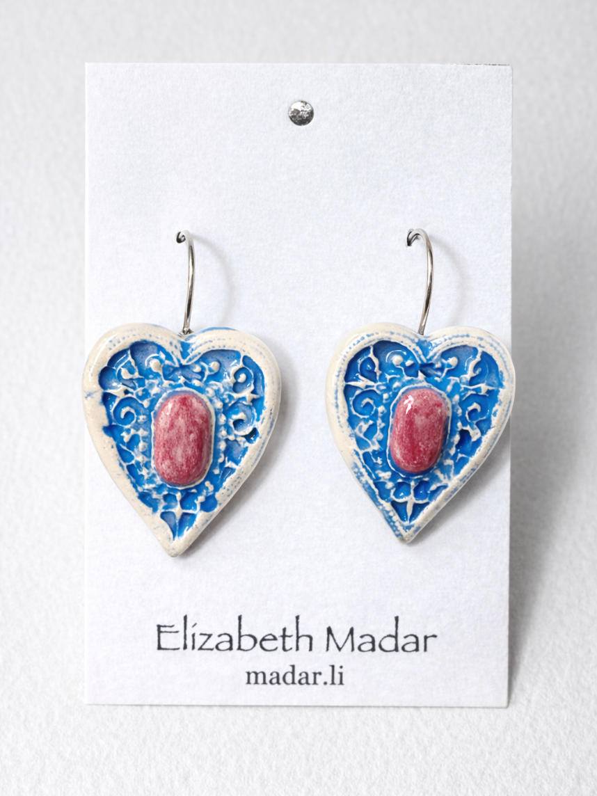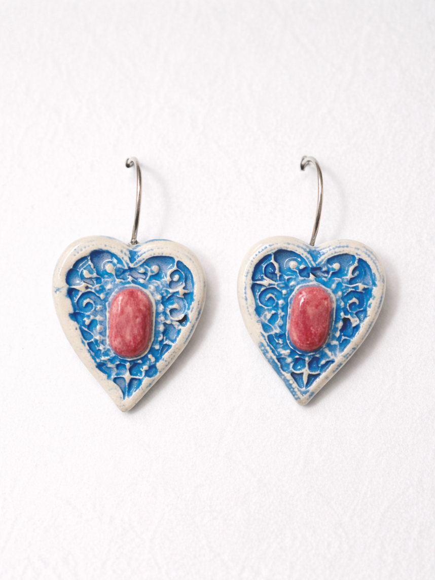 Серьги Сердца большие с орнаментом, синие, керамика