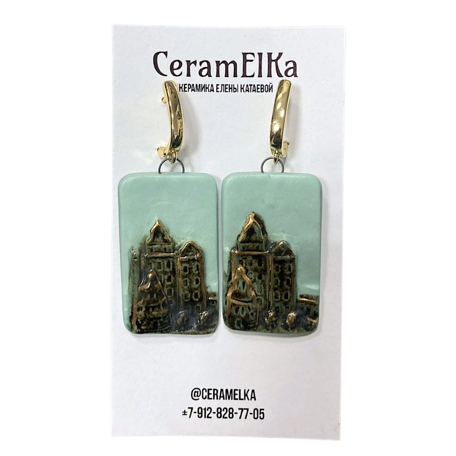 Серьги КерамЕлКа «Старый город», фарфор, мятно-золотистые