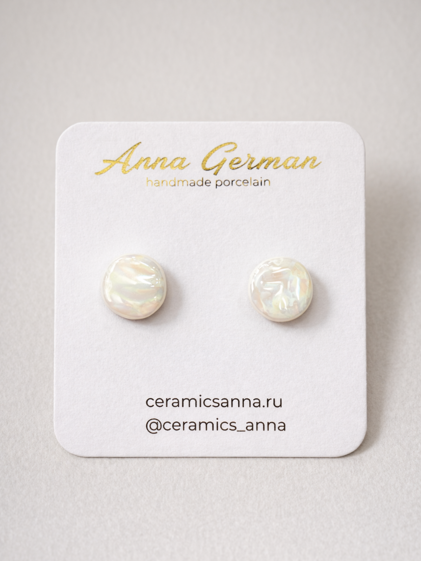 Элегантные фарфоровые серёжки-гвоздики «Круги» белые перламутровые.