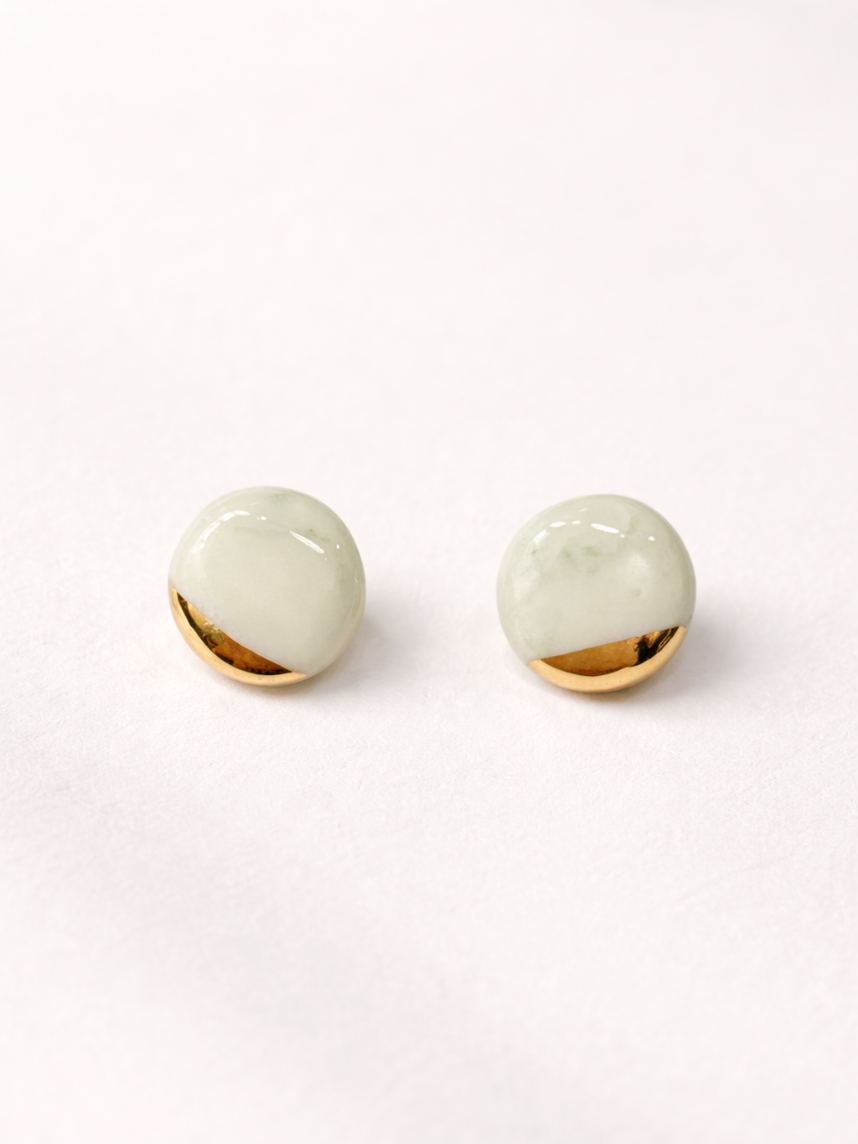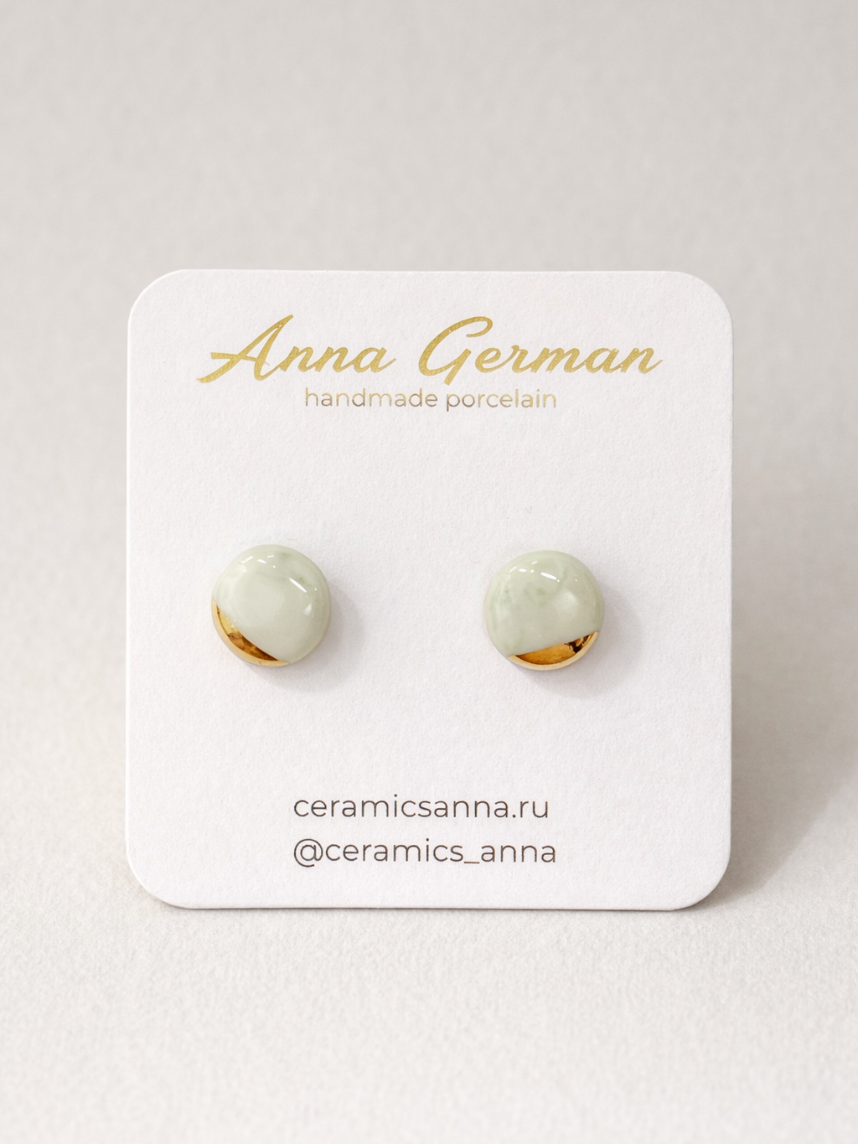 Элегантные фарфоровые серёжки-гвоздики «Круги» зеленый мрамор с позолотой.